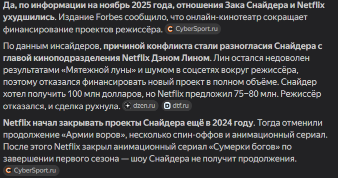 Последние действия Netflix по отношению к проектам Зака указывают на отсутствие у них совместных планов. Возможно, виной тому смешанные отзывы зрителей. Или просто небольшая вовлеченность подписчиков сервиса.