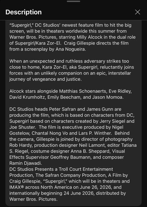 >DC Studios’ “Supergirl” hits theaters this summer, starring Milly Alcock as Kara Zor-El/Supergirl. When an unexpected and ruthless enemy threatens, Kara Zor-El is forced, against her will, to team up with an unlikely companion. Together, they embark on an epic cosmic journey where revenge and justice are at stake – and where Kara must confront her origins to find her own path as a hero. Alcock is joined by Matthias Schoenaerts, Eve Ridley, David Krumholtz, Emily Beecham and Jason Momoa in key roles. Peter Safran and James Gunn are producing the film for DC Studios.