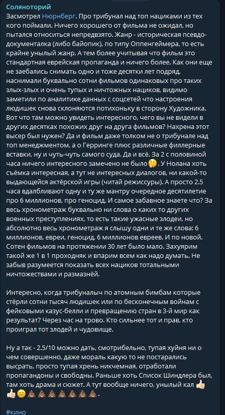 Согл с Папаней. Я сам и не смотрел это кино потому что ожидал от него именно того, что Виталик описывает. Надоели жиды, кроме них еще много кто во второй мировой умирал. Только к мыслям Папича я бы еще добавил, что жидов давно ебут леваки и бабахи, и скоро заебут до такой степени, что Израиль прекрати существовать. Тем временем жиды не с леваками и аллахопитеками навязывают борьбу, а продолжают вкладывать деньги в подавление белых европейцев, их национальной гордости и внушения им чувства вины.