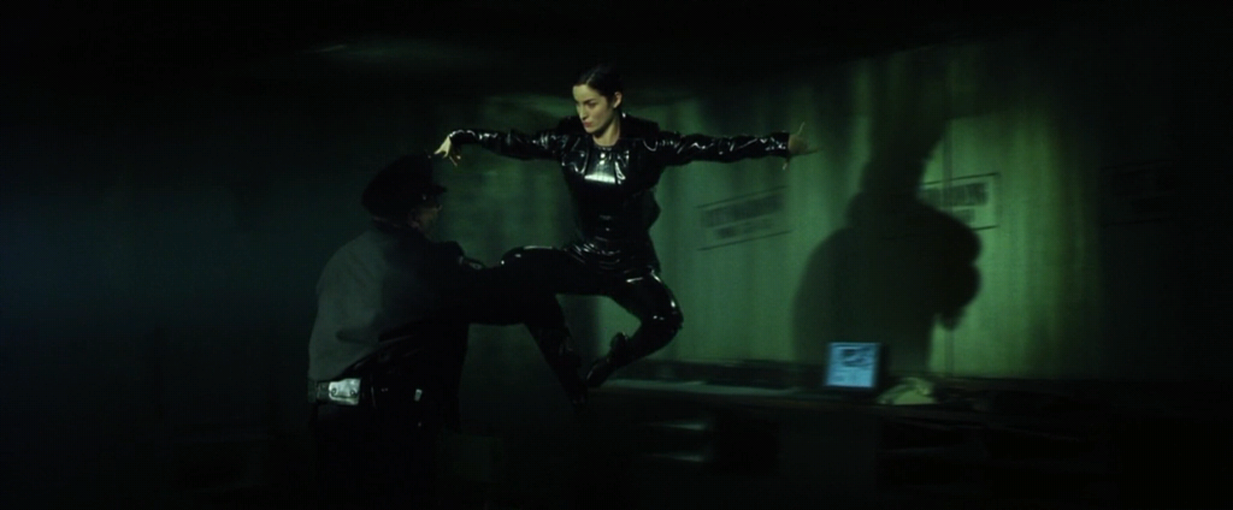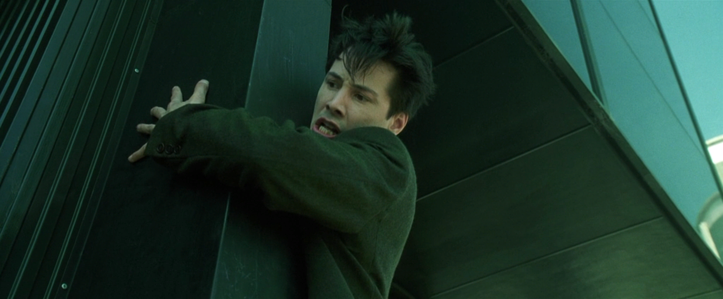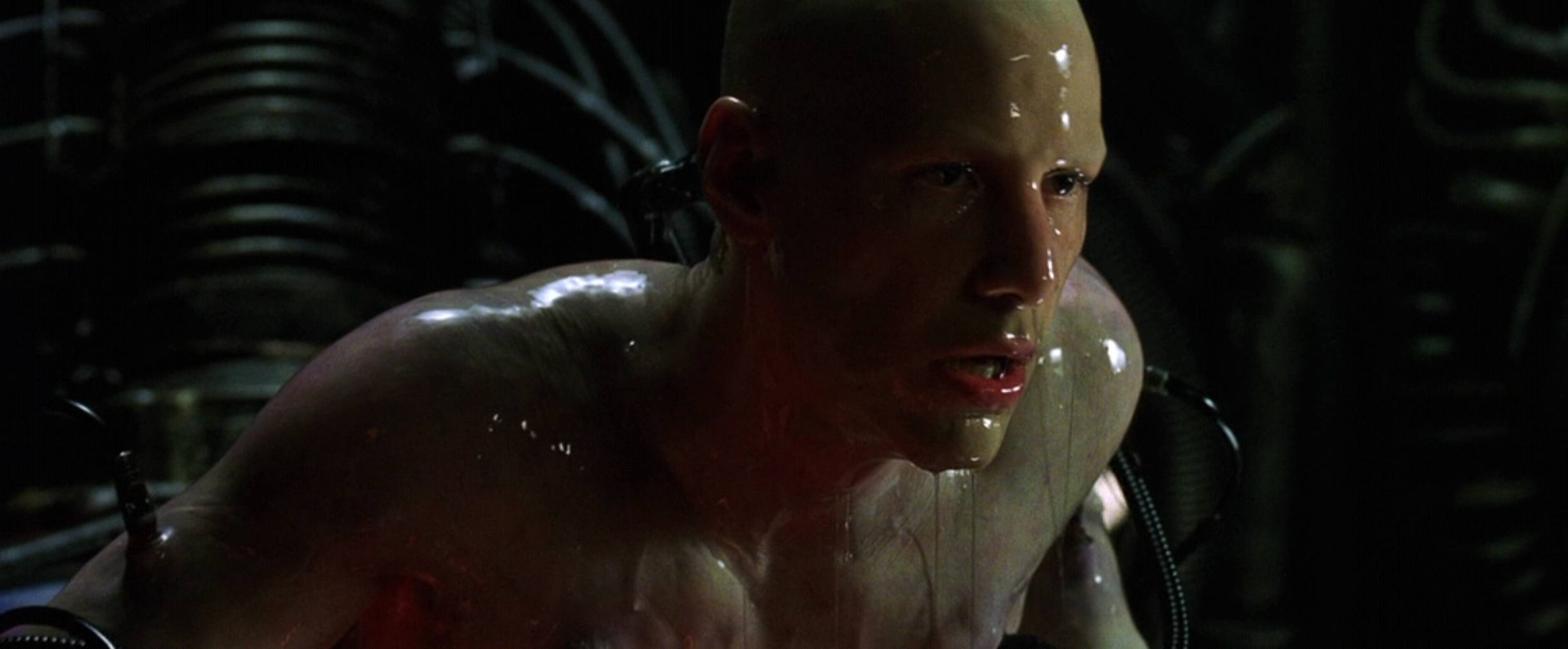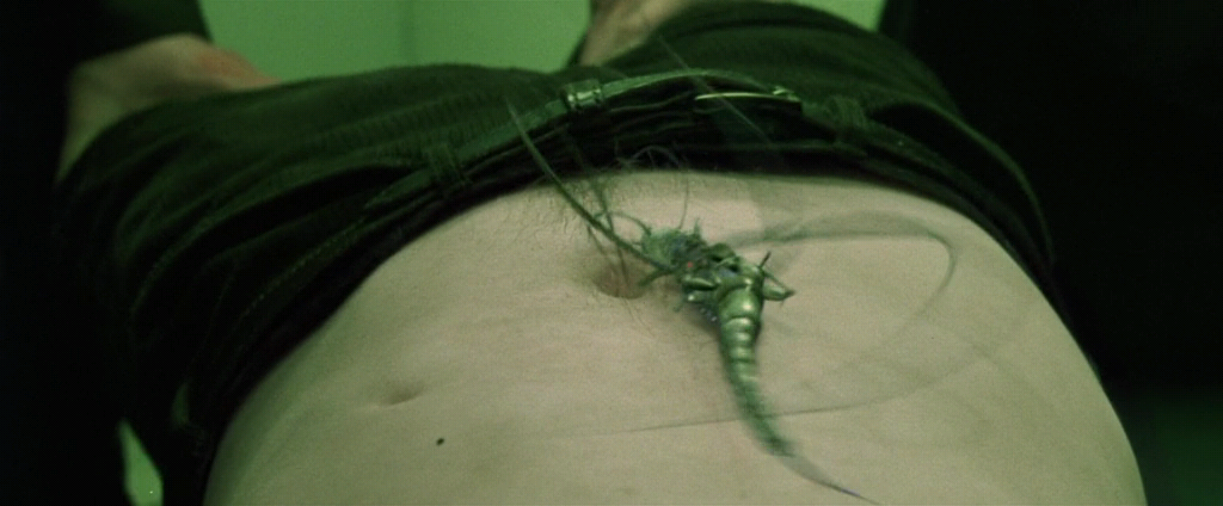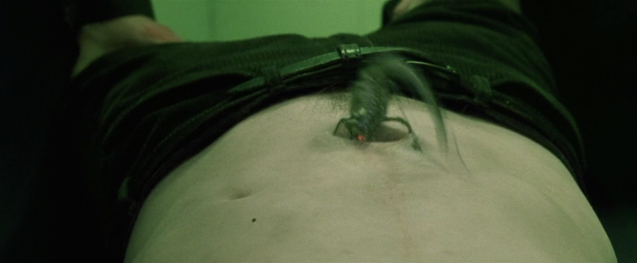 У Киану Ривза два пупа? Что это за второе отверстие слева? Ну или у дублёра его. Необязательно же для такой сцены задействовать топ-звезду "На гребне волны", "Джонни-мнемоника", "Скорости" и "Адвоката дьявола". Можно снять пузяку любого чма за шоколадку. С чма стребовать шоколадку за право сняться у батьев Вачовски. Алсо почему жучка не запихнули в анус вместо пупка?