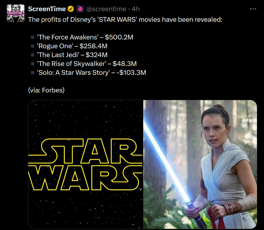 >>4053671 >Купили суперденежную франшизу за 4 лярда >Сняли 5 супердорогих фильма с бюджетами от 300 до 600 лямов >Собрали в сумме один лярд Наверное только мерч держит на плаву все, но фильмы про рей долго не хотели делать.