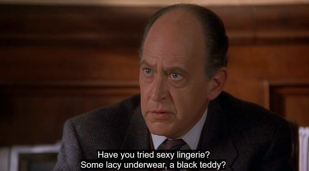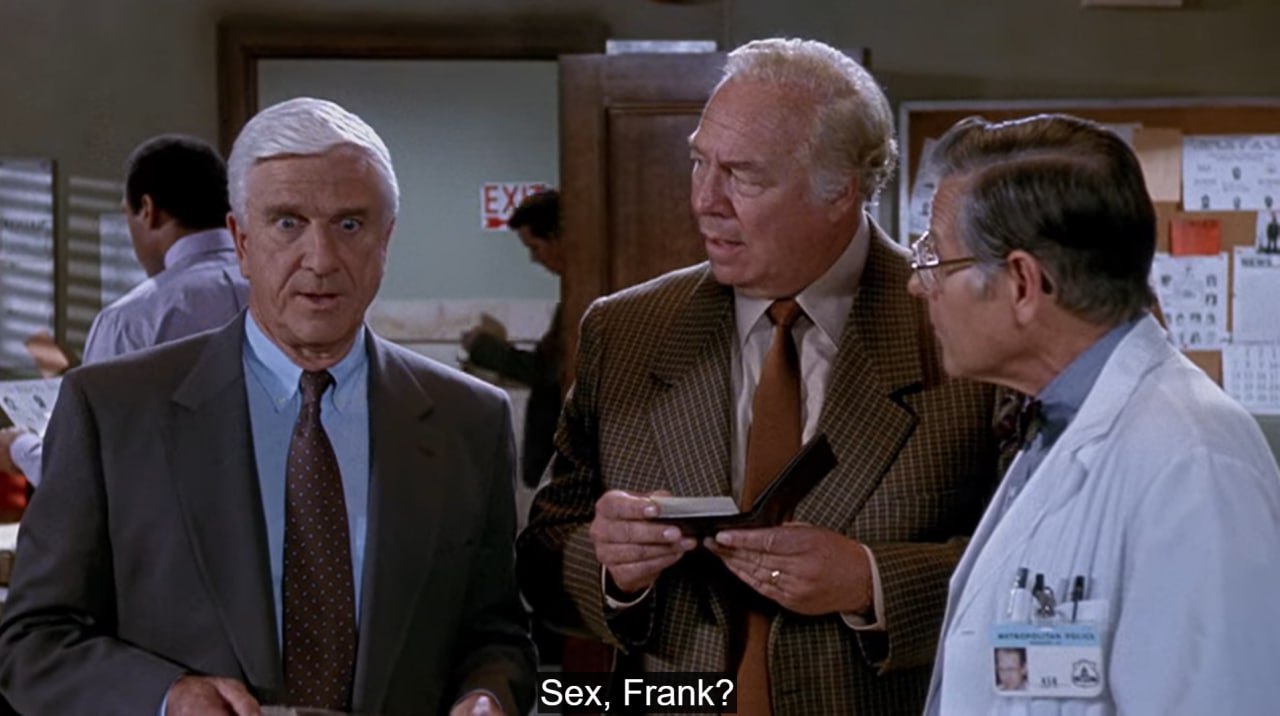 Кстати, наверное, не многие помнят, но Фрэнк Дрэбин – канонично бисексуальный и гендер-нонконформный персонаж. Причём настолько канонично, что уже в первом эпизоде сериала «Полицейский отряд», из которого впоследствии и вышел «Голый пистолет», Фрэнк рассказывает долгую трагическую историю, как он пару лет жил с парнем, но тот уехал из города из-за сыпавшихся на них оскорблений и непонимания общества, а потом женился, «и теперь уже ничего не вернёшь».