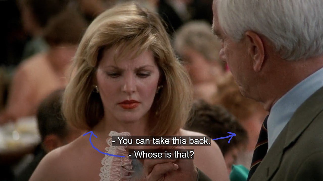 А вот второй снимался в 1990-м, когда были ещё свежи впечатления от проигранных демократами президентских выборов 89-го, и фильм наполнен отсылками к ним. В нём много издевательского слэпстика уже над женой президента Буша-старшего, пара умеренно злых шуток над самим Бушем и несколько разъёбных шпилек в адрес демократов (например, фото их кандидата Майкла Дукакиса на «стене катастроф» в баре и дико актуальная в 2025 году фраза Фрэнка Дрэбина «Я хочу жить в мире, где у демократов есть кандидат, за которого стоит голосовать»).