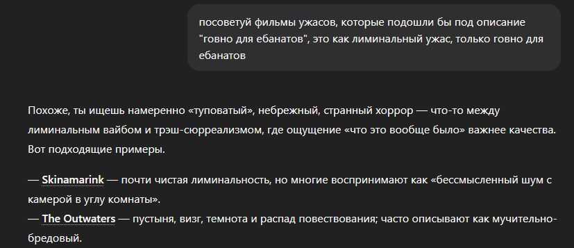 @monkey дай несколько анальных хорроров про анальные аналы бля анон, это хоррор-тред, а не фекальный фаптред. анальных хорроров про жопы не существует в природе, максимум салат из "human centipede" с примесью "the thing" где всё слипается в унитаз.