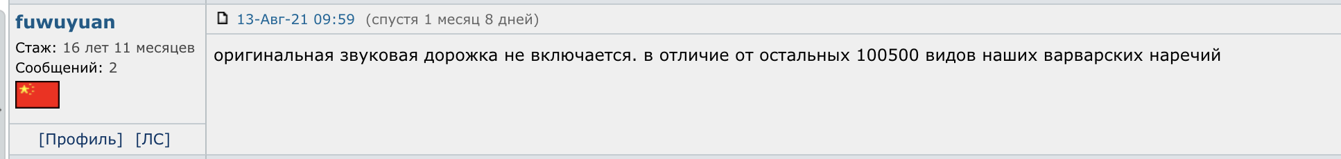 >>4126079 Чушь, добавление любых посторонних звуков на роигинальную звуковую дорожку ПОЛНОСТЬЮ уничтожает впечатление от оной и фильм просто разваливается на части, в кино в звуке, речи, интонациях заложено КУДА больше чем кажется и уж точно никакие смещения фокуса с общего плана вниз даже рядом не валялись с убитой звуковой дорожкой, у тебя любая озвучка просто замусоривает оригинальную дорожку, произношение текста поверх оригинальных реплику другим голосом это просто нахуй похороны, это пиздец, просто у нас народ привык, сначала его кормили совковым дубляжом где переводили как нужно цензуре, потом кормили войсоверами, потом и войсовер и дубляжи стали делать люди которые вообще не понимают что такое работа со звуком, а записывать реплики люди, которые одним голосом начитывают килотонны текста во все места ради заработка, это пиздец, пиздец, и ещё раз пиздец. Фильм с оригинальной дорожкой и фильм с озвучкой это два разных фильма.