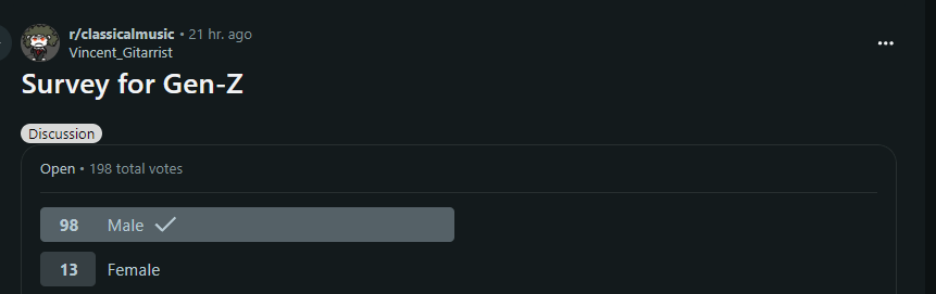 Тут провели опрос и оказалось, что среди молодых (<25 лет) любителей классической музыки тян только 8%. ВОСЕМЬ.
