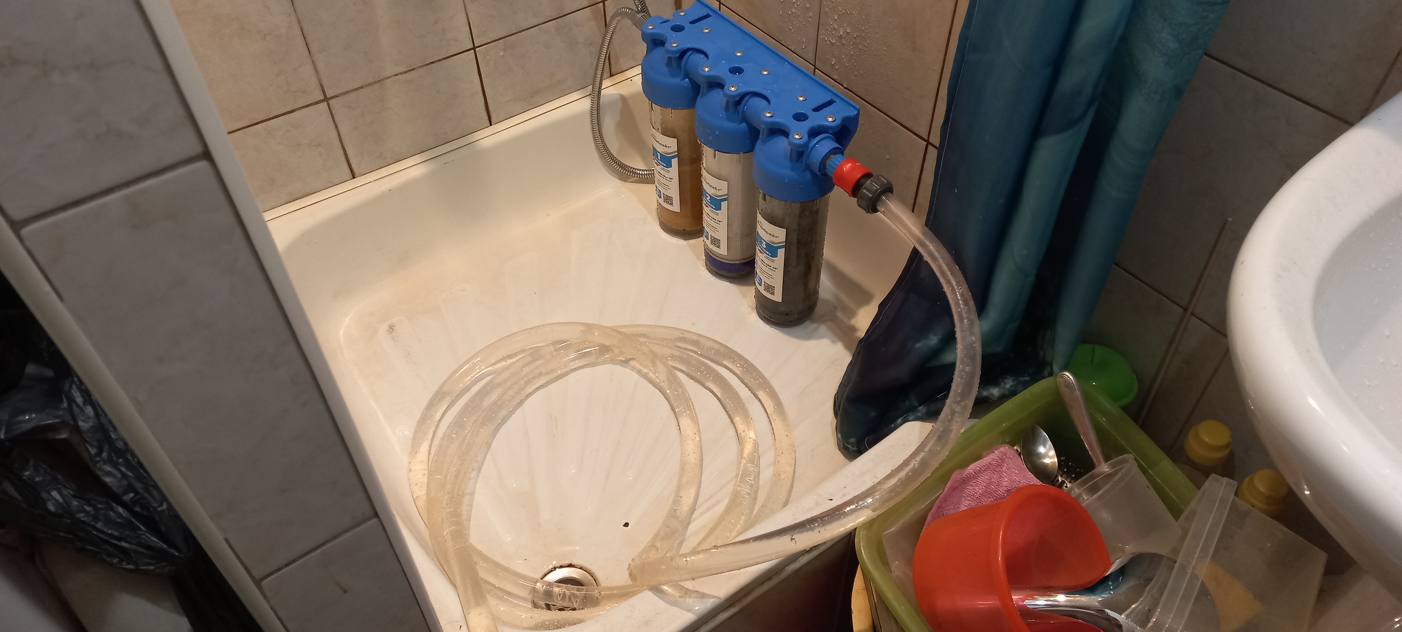 Проложил на постоянку два шланга от банки до ванной через всю квартиру. Сначала хотел использовать просто гофру но она внезапно оказалась дырявой как решето, так что внутрь были засунуты шланги. В самп закинута помпа которая управляется через релеху контроля уровня жидкости. В ванной через приблуду сделал 2 душевых шланга, один из которых соответственно через проточный фильтр идет на залив. Дальше в другой комнате стоит 100л бочка, в нее заливается вода чтоб она отогревалась до комнатной температуры плюс можно было точно отмерять объем подмены, в этой бочке лежит еще одна помпа которая уже перекачивает воду в банку.