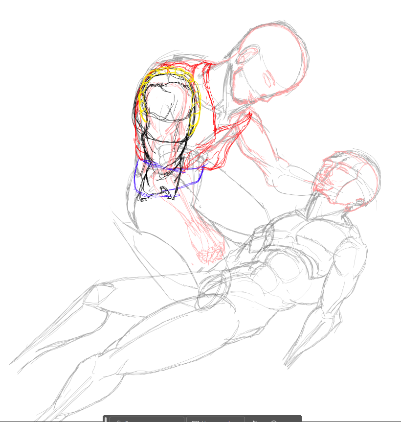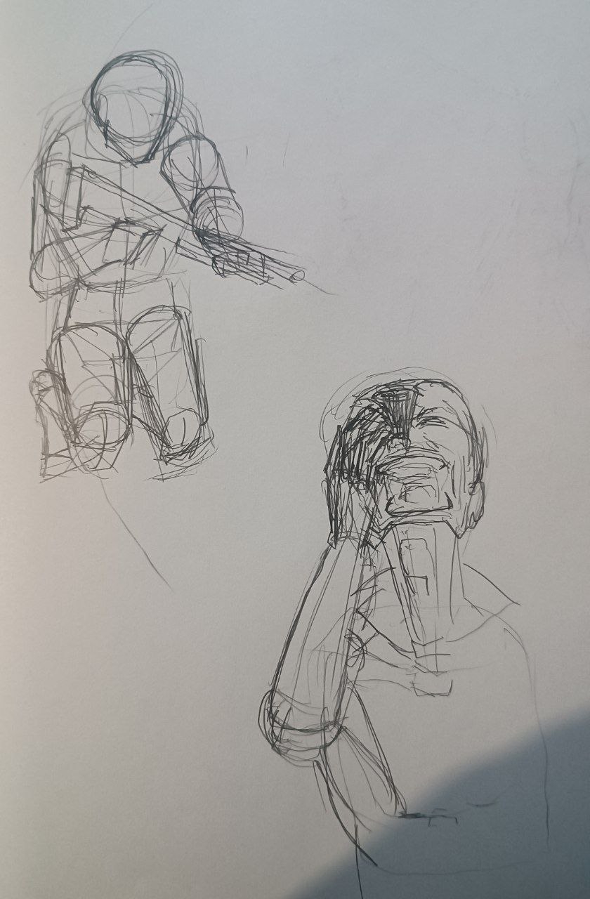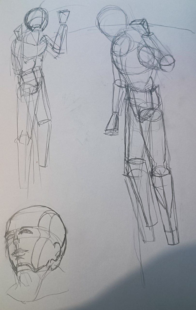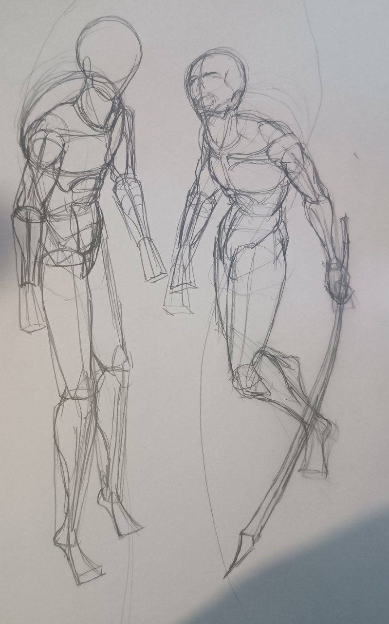 вечером: надо повторить принцип построения из книги Дэвида Росса. надо обратить внимание на пропорции манекенов. надо обратить внимание на поворот манекена в пространстве. мышцы пока не прорисовывать.