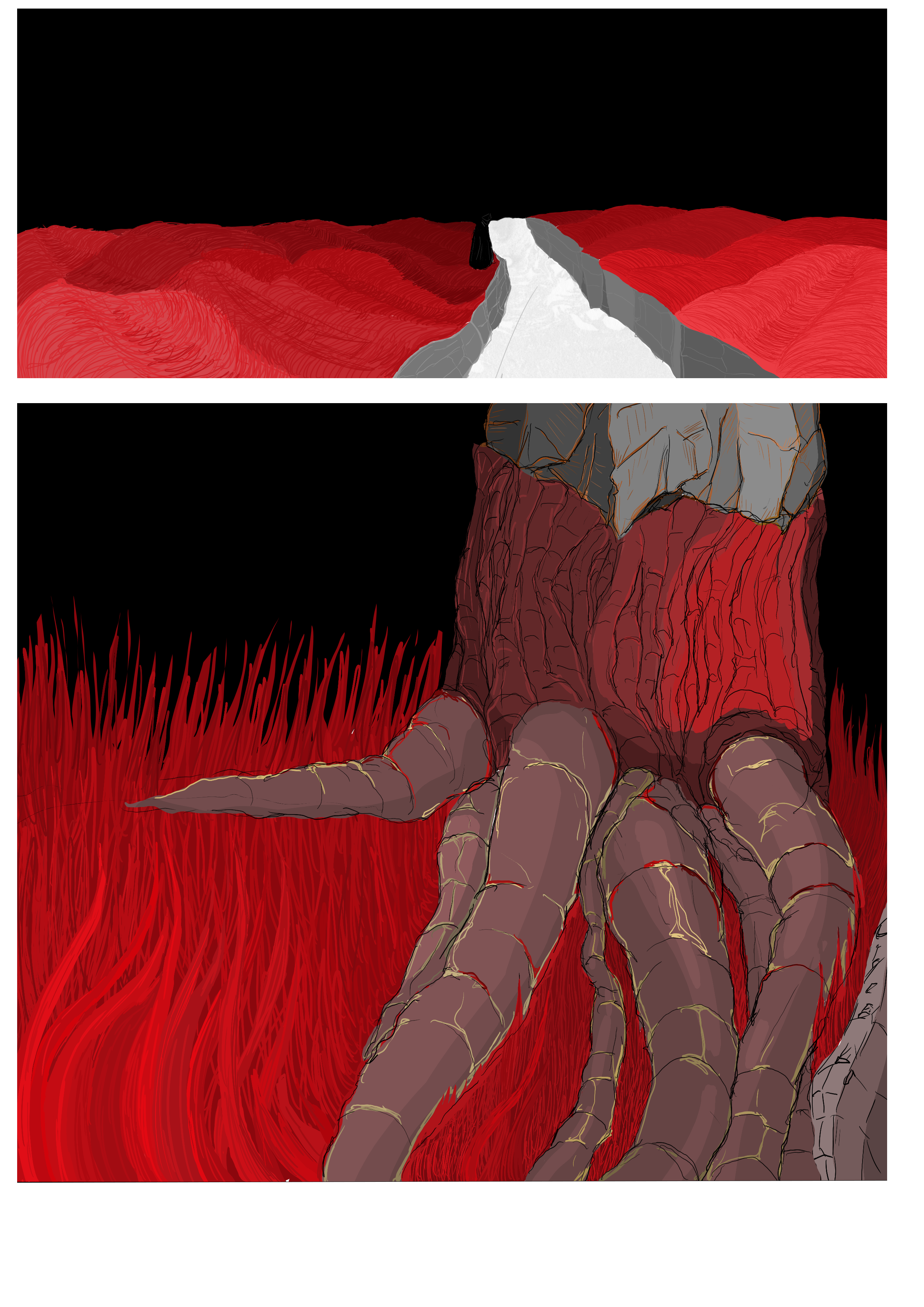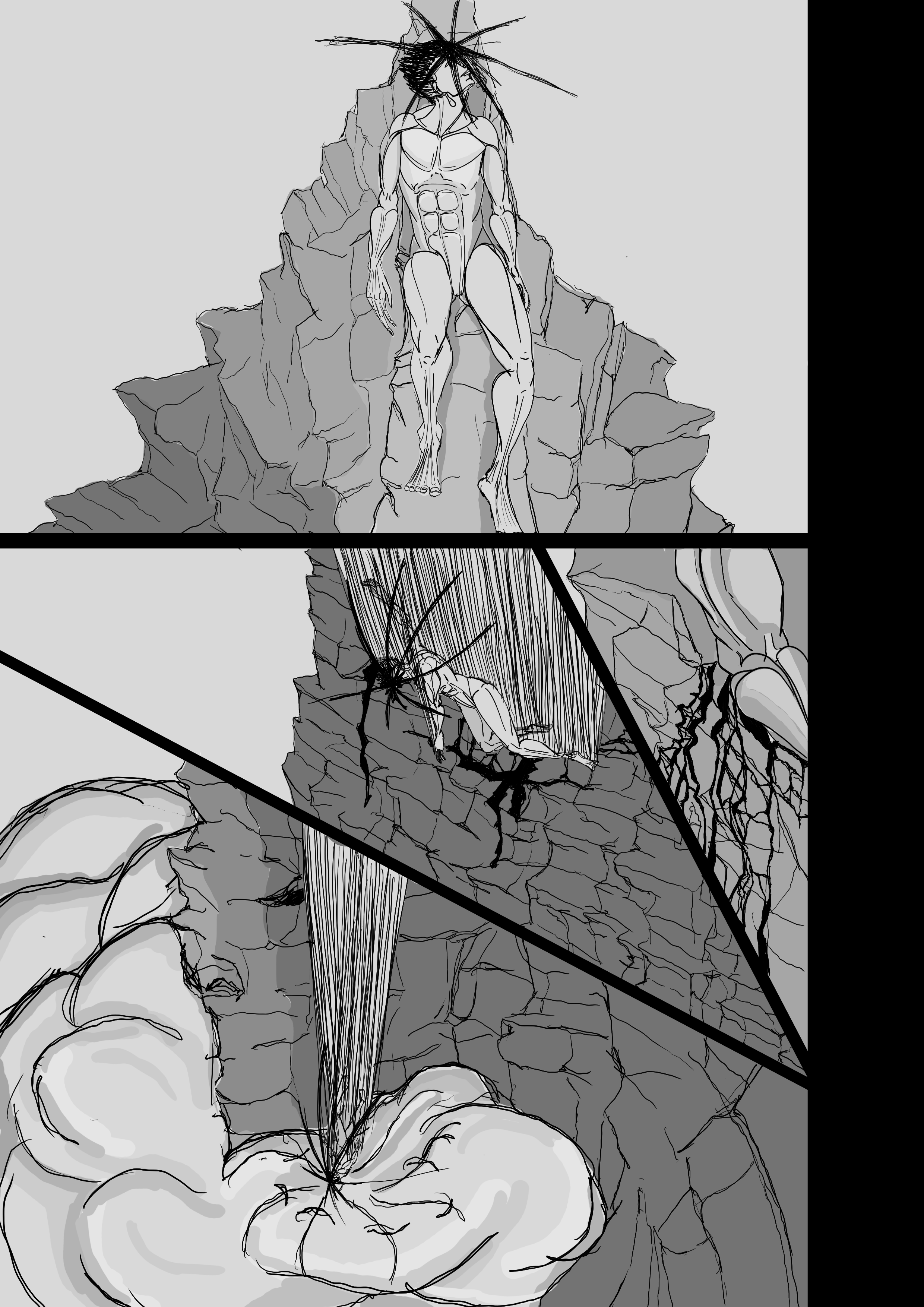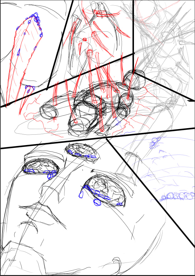 к разворотам подхожу с точки зрения акцентов скорее. эта манга это по сути ещё одна проба пера с чуть апнутым скиллом, поэтому тут пока наугад и по наитию. то есть разворот это как удар по ебалу, когда обычные страницы и фреймы - сетап и навязывание ритма.