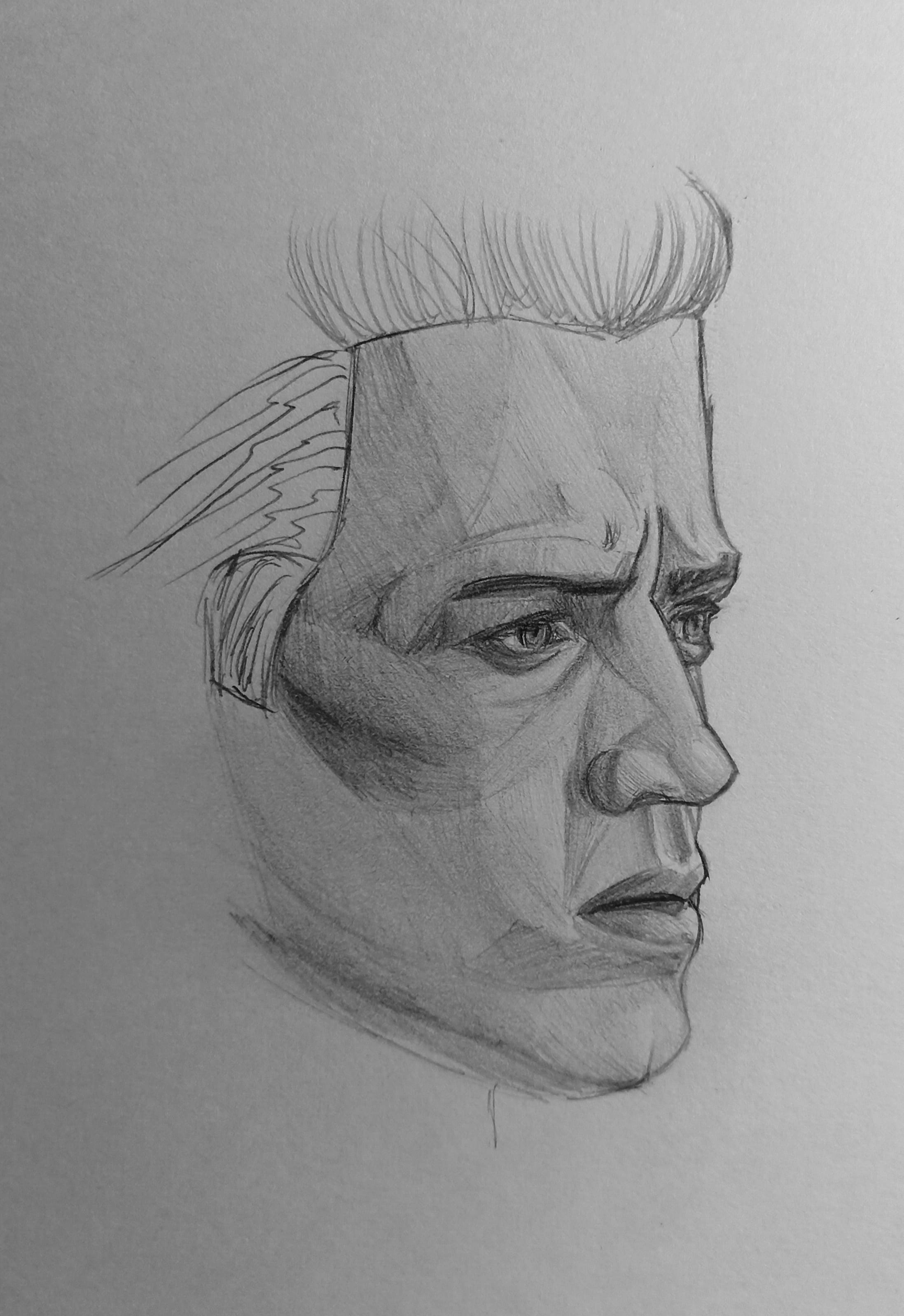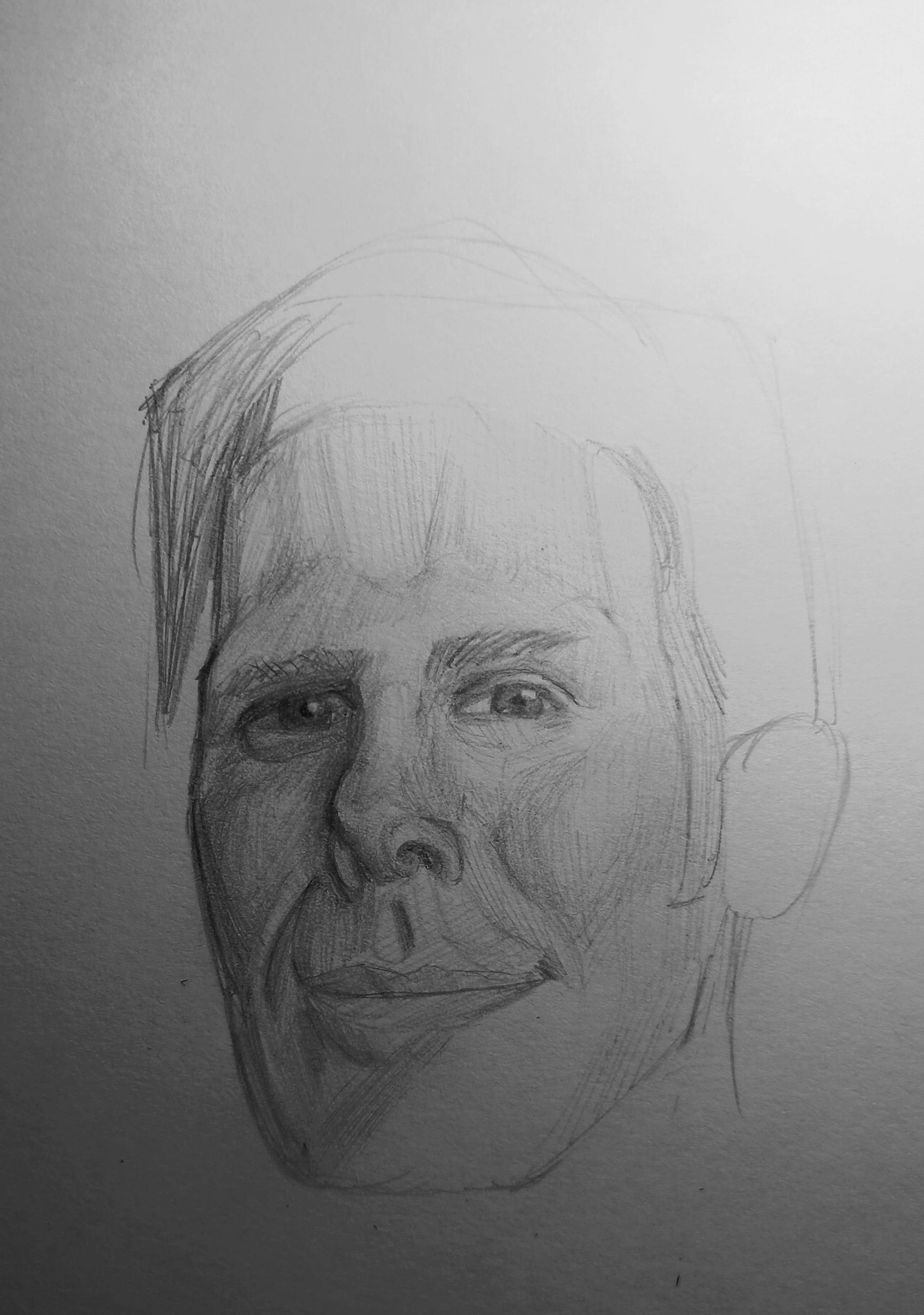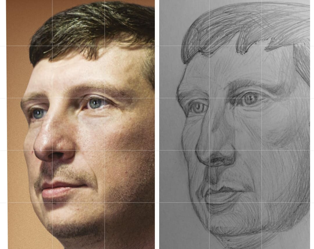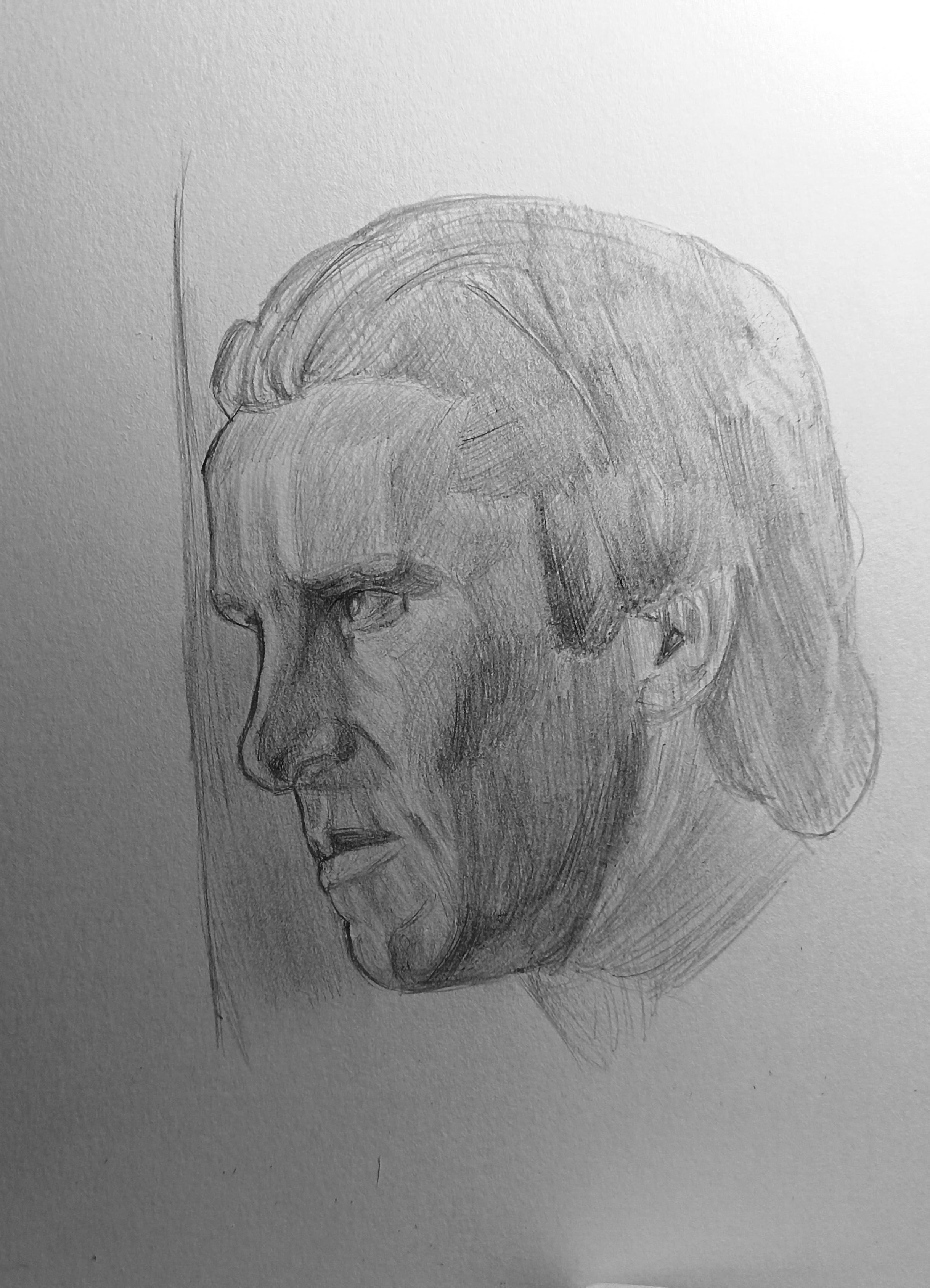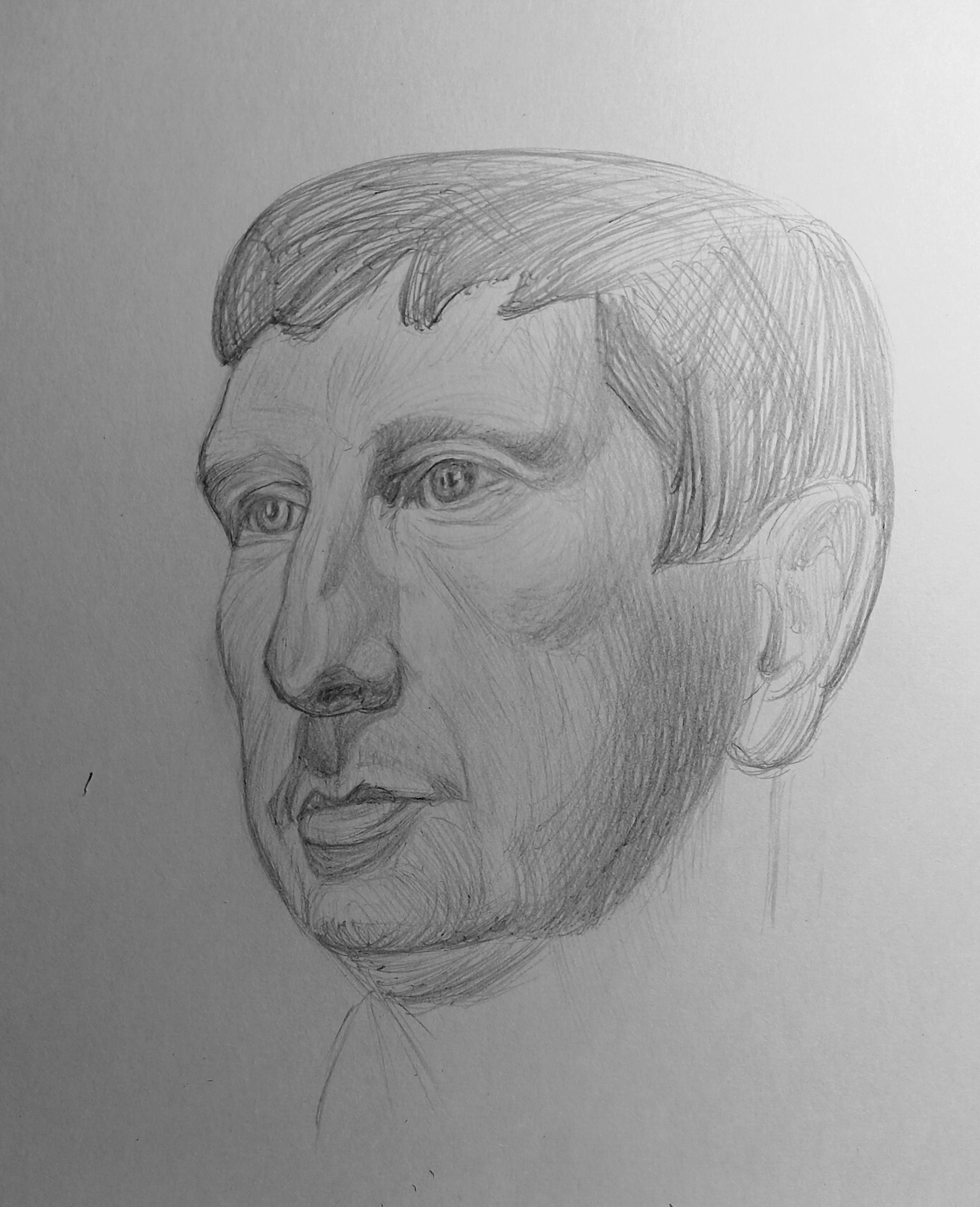 Надо не просто примерно промежутки визированием, а еще и ключевые точки черепа отвесами перепроверять. Слишком слаб у меня глазомер и то что нос длинее я начинаю понимать только когда уже начинаю класть штрих. Ну хоть штрих тренирую по форме