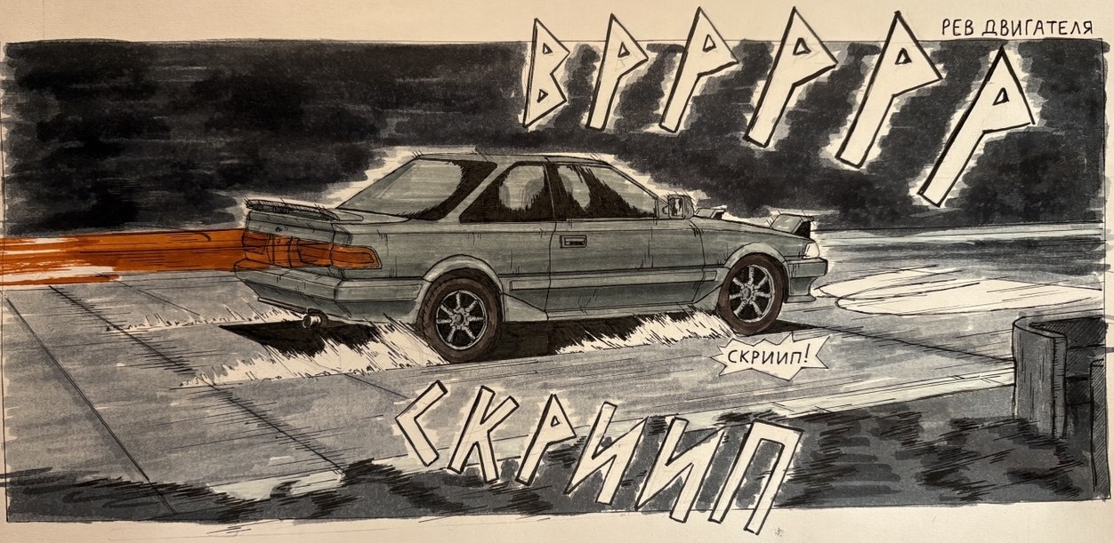 >>923504 → в глаза в первую очередь бросается что по пропорциям машина какая-то толстая и мыло под колесом. потом становится видно что композа как то плохо передает смысл происходящего на редлайне вообще хочется эту машину как угодно сдвинуть, лишь бы вот этого ракурса снизу вверх не было, но я его оставлю потому что чертить всю машину в новом ракурсе я точно не буду, плюс опять будут ныть что ракурс поменял и поэтому нещитово >пропорции если у тебя окна занимают где-то 2/5 высоты машины, то и в фишае тоже должно быть 2/5. на пикче окна очень маленькие, из-за чего машина выглядит ненатурально. машина в целом слишком квадратная и задница слишком большая как по мне, если смотреть на страницы из того же инишл ди, то там мангака, кроме железного соблюдения пропорций, всегда четко отрисовывает крылья, бамперы, изгибы и швы на корпусе >мыло на машине кисть применена вполне себе, потому что там ты в принципе понимал как форма изгибается (квадратно, но все таки), а на земле ты в принципе не понял как форму горы с травой показать и поэтому развел мыло в нормальном случае нужно мягкие переходы формы показывать мягкой кистью, а жесткие жесткой. грубо говоря бок цилиндра можно показать мягкой кистью, а торцы отделить от него жестко с травой все довольно просто, потому что у низа пучка все можно заливать мылом, потому что там расстояние маленькое, а сверху жестко очерчивать силуэт каждого куста, потому что там больше расстояние >композиция композиция это отчасти умение располагать предметы в кадре, так чтобы зритель увидел и понял все, что изображено на картинке. в этом кадре много места занимает небо и это наверное хорошо, но масса машины и масса горы во1 сливаются, а во2 похожие по размерам в кадре. что-то одно должно быть больше или вообще не должно быть в кадре. акцент должен быть на тачке, поэтому все остальное я бы верызал/уменьшил максимально. в целом если вы можете что-то из кадра вырезать за ненадобностью, это надо вырезать. еще из важного, в инишл ди, четко видно что машину в кадре заносит от того направления в которое она дрифтует. т.е. если машина едет направо, то она в левой половине кадра и наоборот. у тебя она дрифтует направо/к центру кадра, и находится справа/в центре кадра. еще там постоянно показывают противника в гонке, который немного впереди, это тоже стоит добавить >идея при таком вылете машина или встречает лбом гору, либо вываливается за барьер, не очень понятно какой исход должен быть. я это максимально обрежу потому что иногда надо все таки уменьшать себе количество жопочасов за счет упрощения картинки