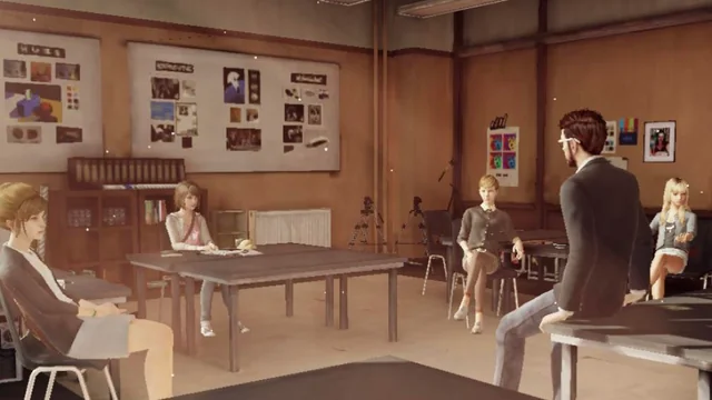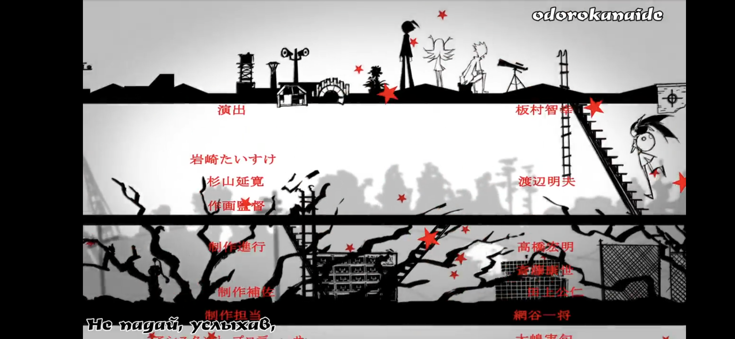 Здесь заложена дефолтная композиция где центр это отношение между двумя людьми, один идёт в сторону зрителя а другой наоборот стоит смотря на зрителя. Под дефолтной, я имею в виду что вы это уже видели 100% в каком-то опененге в одном из кадров. Ну знаете... оба спина к спине сидят, один стоя смотрит в небо а другой сидя на землю, один хмуро держит оружие в ножнах а другой держит оружие на плече и лыбится итд.