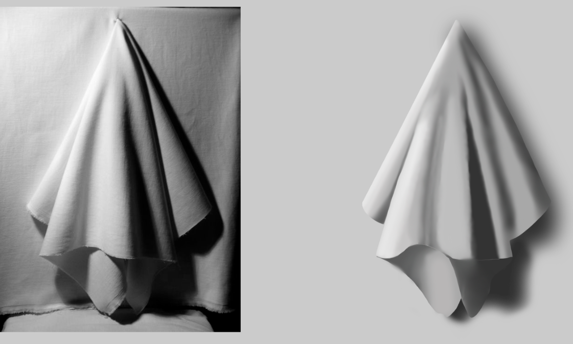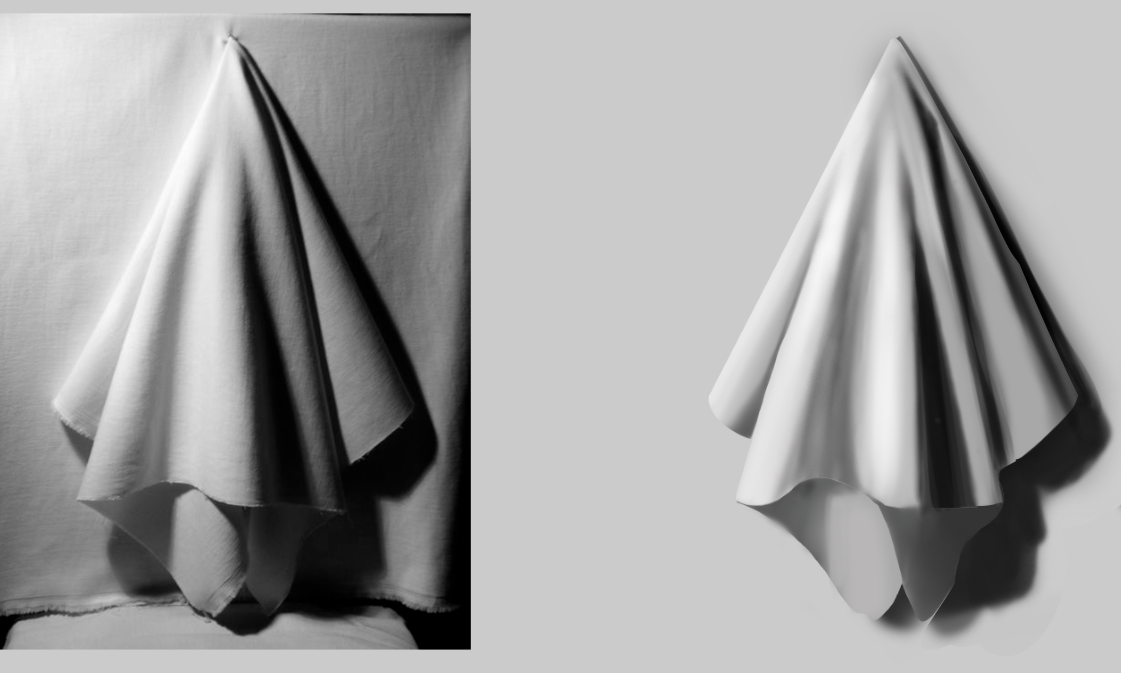 >>925145 В целом получилось хорошо, просто будь внимательнее. На пик1 у тебя на центральной складке потерялся контраст: пропустил терминатор на собственной тени и не разделил падающую тень и оклюжн(они у тебя одним тоном). Складка правее у тебя нарисована как небольшая неровность, на рефе же там глубокая складка с падающей тенью. Падающую тень справа вообще пропустил, сделал только оклюжн, там же пропустил терминатор и рассеяный свет. Снизу довольно жесткие тени сделал мягкими.