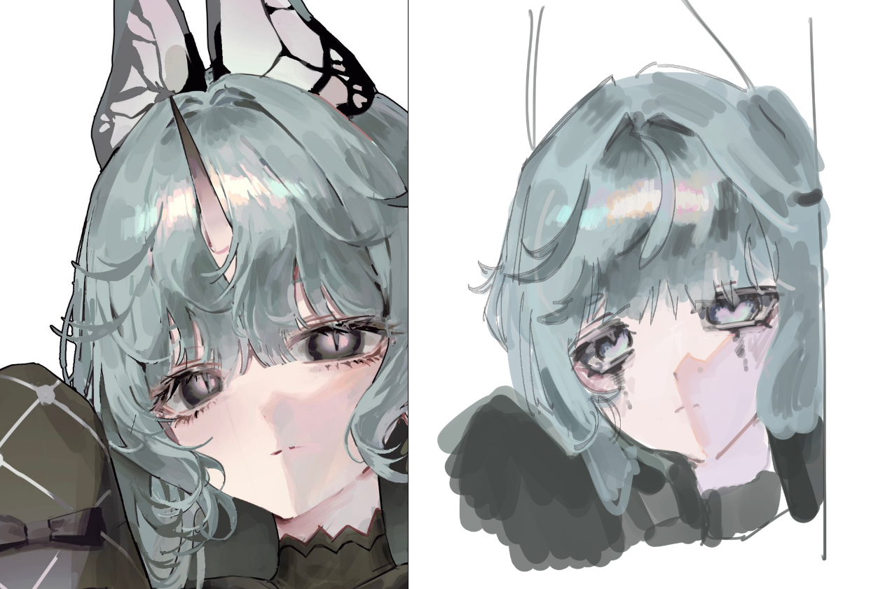 >>941152 >никто этого не знает, все хуярят на глаз. ПРОСТО в аниме расстояние между носом и подбородком больше чем между носом и бровями потому что это мило. А когда чедов рисуют, наоборот нижняя часть больше. Но это ситуативно и от стиля зависит, аниме тоже разное, есть более реалистичное, есть где прям оч пропорции другие Ты в крите рисуешь? Попробуй скетчить пикрил кистью размером 1-2 пикселя. Попробуй пока не лайнить потому что лайн это отдельный сложный навык. Ну или если лайнишь, попробуй тонкой кистью это делать. на всех твоих рефах лайн размером 1-2 пикселя,а у тебя жирная черная кисть. Вообще у тебя нормальный лайн на тех манга фреймах, просто именно анатомия и детали не оч, для этого надо побольше скетчить. Рисуй всегда на новом слое, не на background. А красишь под ним. Если чет не получается нажми ctrl z. или E чтобы ластик включить, и опять E чтобы выключить. размер ластика можно менять там можно в его настройках сделать чтобы отдельно размер ластика и размер кисти. На букву L выделение лассо, например выделить и подвинуть что-то чтобы стало на свое место. Выделяешь, нажимает ctrl t и двигаешь. Чтобы убрать выделение shift+ctrl+a. Кисть на букву B. >>941154 Так я тому челу отвечал потому что он хотел разобраться в программе