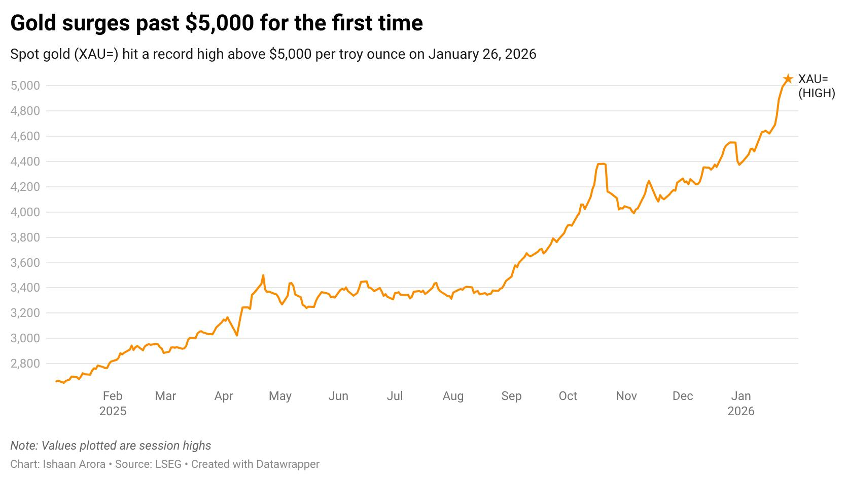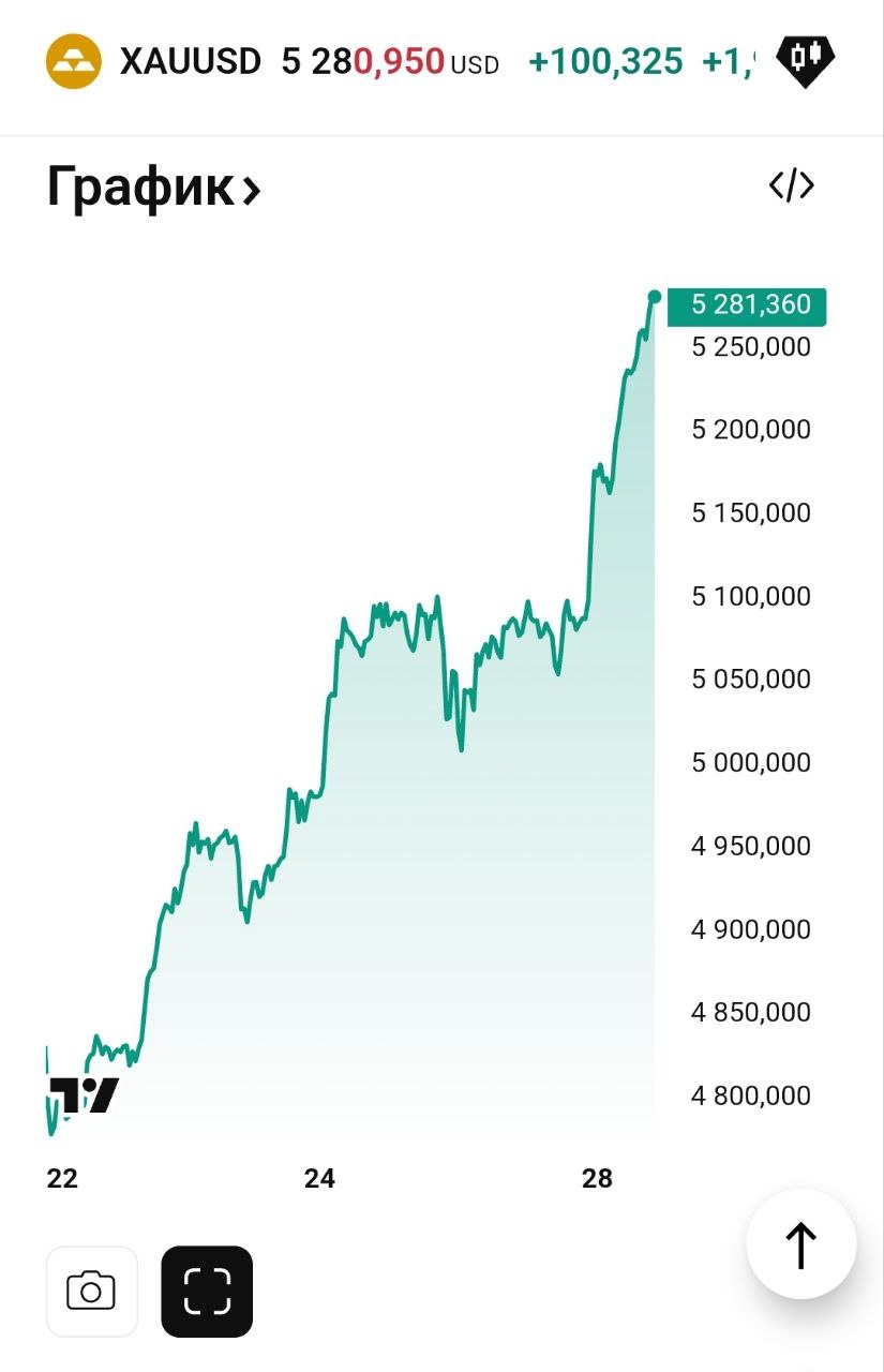 Всего пару дней назад спотовая цена на золото колебалась около 5100$ за тройскую унцию. Сегодня она стремится к 5300 и вероятно пробьет отметку.