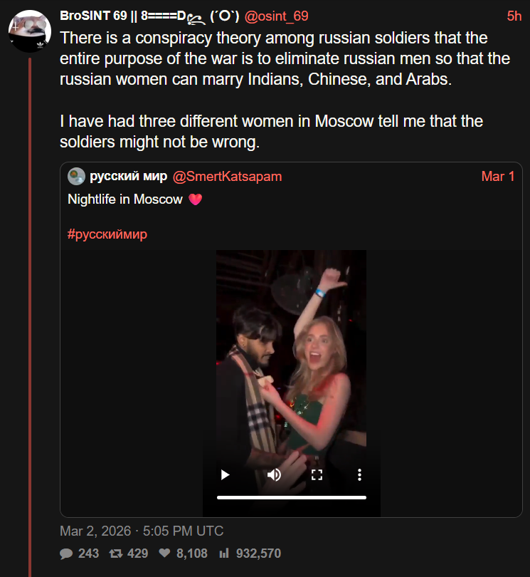 Аноны, патриот на связи. В англоязычном инете набирает популярность ляберухский псиоп русского мира, тысячи просмотров, лайков и комментов. Прискорбно то, что он больше начинает походить на правду, чем на вымысел. И я трясусь от этого, образ страны как белого базированного традфайв этностейта буквально на глазах улетучивается с каждым репостом подобных псиопов. Каким копиумом нужно ебебываться, чтобы пережить это?