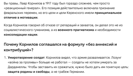 Ты понимаешь, что победа до победного конца ничего уже не давала солдатам, так как керенский и корнилов отказались от репараций? Война по сути для империи была проиграна в феврале 1917 года.