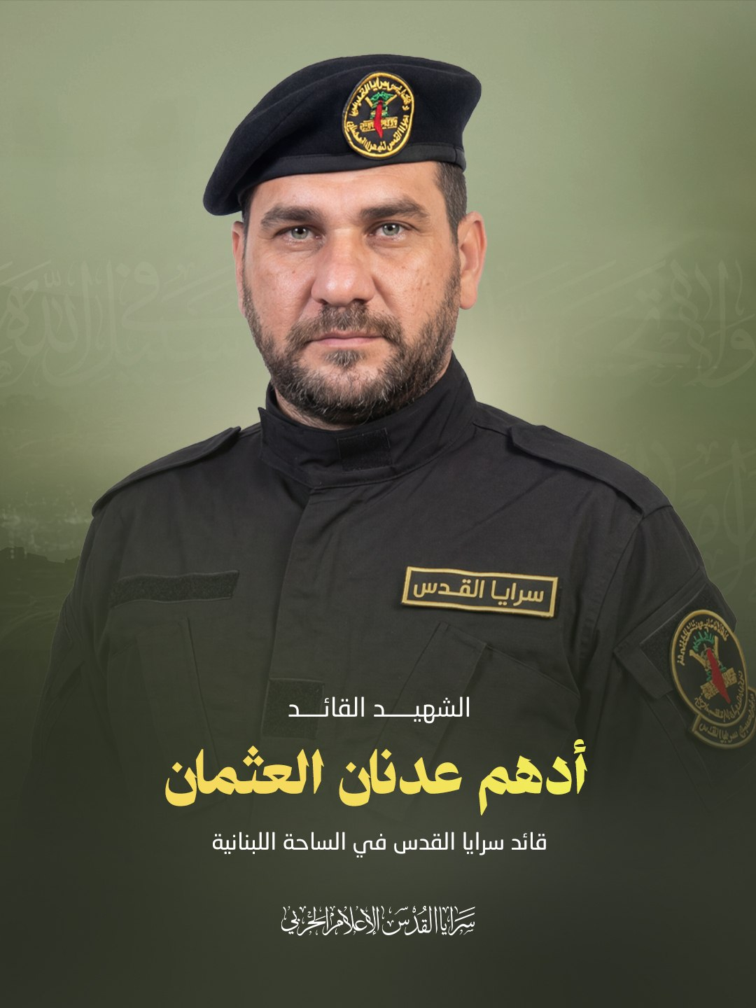 Палестинская террористическая организация «Исламский джихад» объявила о гибели Адама Аднана Аль-Османа «Абу Хамзы», командира бригад «Аль-Кудс» на ливанской арене, ликвидированного в результате удара ВВС Израиля в южном Бейруте рано утром сегодня.