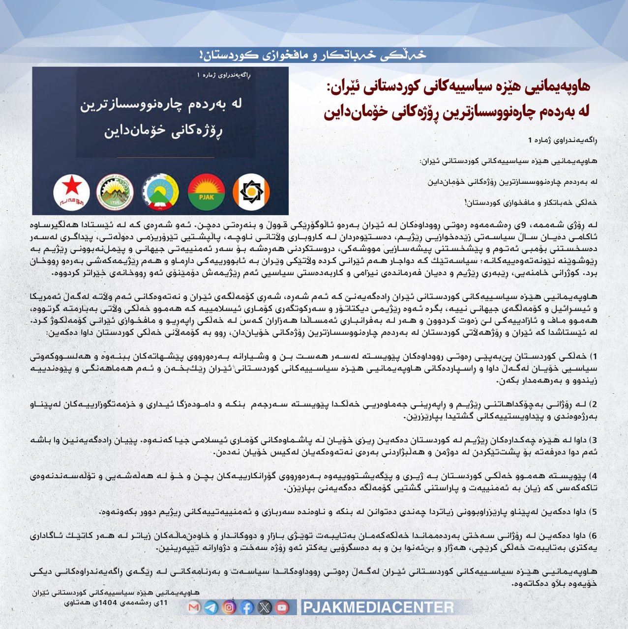 В заявлении содержится предостережение от хаоса и проявления бдительности, призыв к обеспечению безопасности баз и центров режима и призыв к владельцам магазинов, семьям и уязвимым сообществам проявлять осторожность и взаимную поддержку в предстоящие трудные дни.