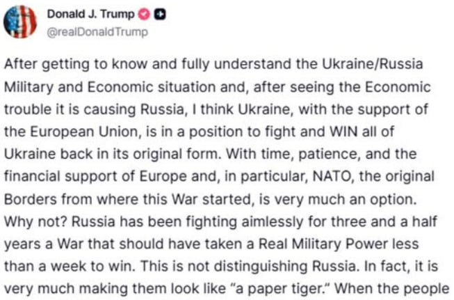 >«Запасы боеприпасов США среднего и выше среднего класса никогда не были такими высокими и лучшими. Как мне сегодня сказали, у нас практически неограниченный запас этого оружия. Войны можно вести «вечно» и очень успешно, используя только эти запасы (которые лучше, чем лучшее оружие других стран!). Что касается самого высокого уровня, у нас есть хороший запас, но он не там, где нам хотелось бы быть. Много дополнительного высококачественного оружия хранится для нас в отдаленных странах. Сонный Джо Байден потратил все свое время и деньги нашей страны, ОТДАВАЯ все П. Т. Барнуму (Зеленскому!) из Украины — на сотни миллиардов долларов — и, хотя он раздал так много сверхвысококачественного оружия (БЕСПЛАТНО!), он не потрудился его пополнить. К счастью, я восстановил армию в свой первый срок и продолжаю это делать. Соединенные Штаты обеспечены всем необходимым и готовы к БОЛЬШОЙ ПОБЕДЕ!!! Спасибо за ваше внимание к этому вопросу. Президент Дональд Дж. Трамп».