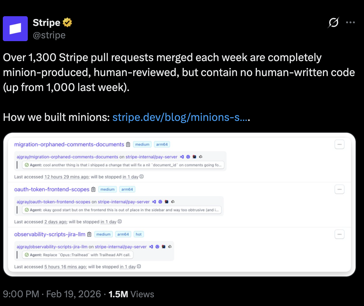 - Stripe в феврале 2026 опубликовала часть 2 своего инженерного блога про систему "Minions" — автономных AI-агентов, которые пишут код от начала до конца. - 1,300 PR в неделю — подтверждено, и это апдейт с предыдущей цифры в 1,000. - Люди только ревьюят код, не пишут его. - Агенты запускаются через Slack, работают на изолированных EC2 боксах, имеют доступ к ~500 внутренним инструментам через MCP-сервер.