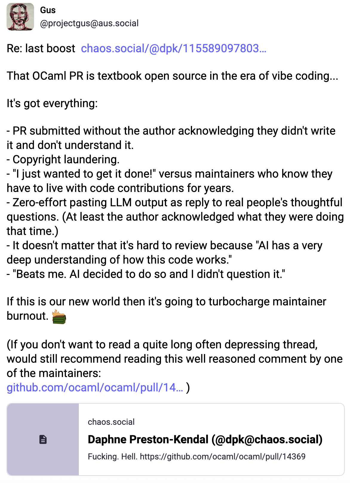 Смотрю на реддите в соотв. разделе что там люди с жптишкой создают, и мне кажется итс овер. Буквально михалычи 40 лет с опытом работы в пятерочке кодируют себе работающую аппликуху чисто на промтах. И это блин работает. С первого раза? Нет. Без багов? Нет. Понимает ли михалыч, что его программа делает? Нет. Претендует ли михалыч на место кодера? Нет! Нахуя теперь нужны кодеры и кодерские галеры, если михалыч с образованием 7 классов может надиктовать голосовухой ИИшке че делать, и через несколько итераций получить готовую фичу. Итс овер гайс, итс овер. Я фильтровал некоторое время заебавший хайп по ИИшке, но это игнорировать уже просто невозможно.