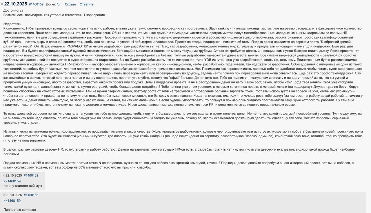 Чел, бигтех это хуйня на палочке. Ты думаешь, люди так сильно любят свою работу в Амазоне или Мете, где постоянно голодные игры идут и ты в любой момент рискуешь на пип улететь просто с нихуя? Да никто не любит это говно, это залупа, а не работа. Люди там сидят просто потому что эти бигтехи сделали им рабочие визы и еще платят нормальные деньги. Заниматься продуктовой разработкой в таком гавне на джаве или hack смысла нет. Смысл есть расти как разработчик в инфраструктуре, который сидит и какие-то байты в сетевом стеке дрочит, чтобы виртуальные сети в AWS работали быстро или видео в фейсбуке и инстаграме не тормозили и быстро прогружались. Но фейсбук и амазон платит зп + стоки. А что платит яшка? Если раньше хотя бы rsu были, то теперь их тупо нет. А так во многих конторах поменьше с меньшей зепехой часто условия труда будут лучше. Тупо рассос и без тряски.