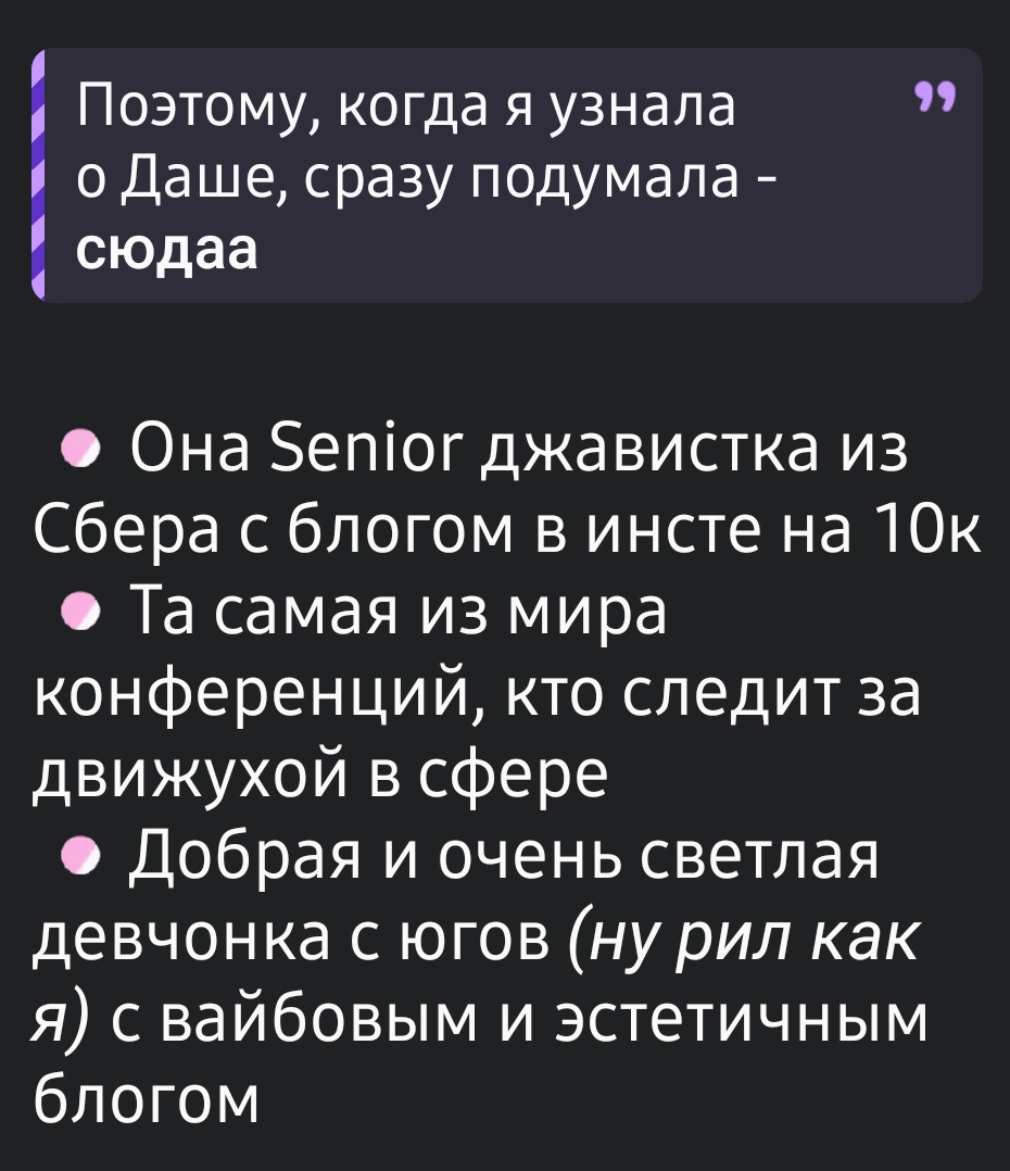 Хочу с 400к подняться до 600к рублей. Думаю пойти на карьерную консультацию к Лесе Набоке. Посмотрел контент, видно что тянач прям шарит за все и сможет меня приткнуть куда нужно. Единственное что не по себе, то что она так общается, очень грубо. Порой создается впечатление что она либо мне ебало набьет, либо отстрапонит.