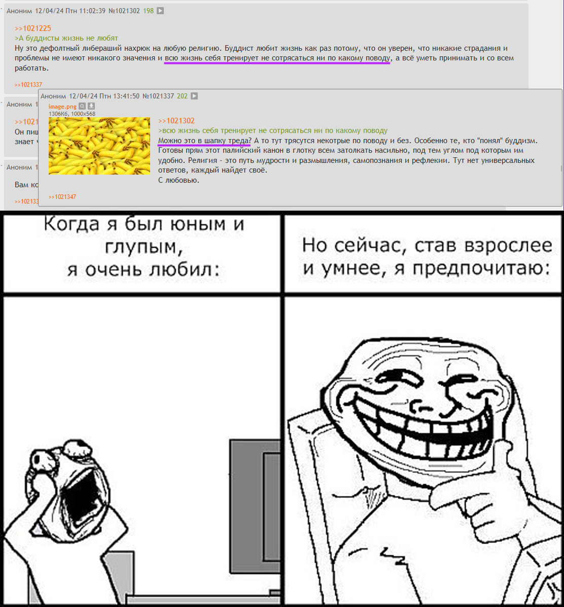 >>1152421 >Это не дается по щелчку пальцев. Ну вот, знакомый сценарий: >>1155471 → >Как так? Я такой умный и так много терминов выучил! Так сильно отсидел свою попку в позе лотоса! Он не тру, я тру! Он обманывает! Вот посидит как я 40 лет тогда и получится! И ваще пробуждения можно достичь только за 3 неисчислимые кальпы! И обязательно быть монахом! И надо бомжом быть с одной миской иначе не тру!