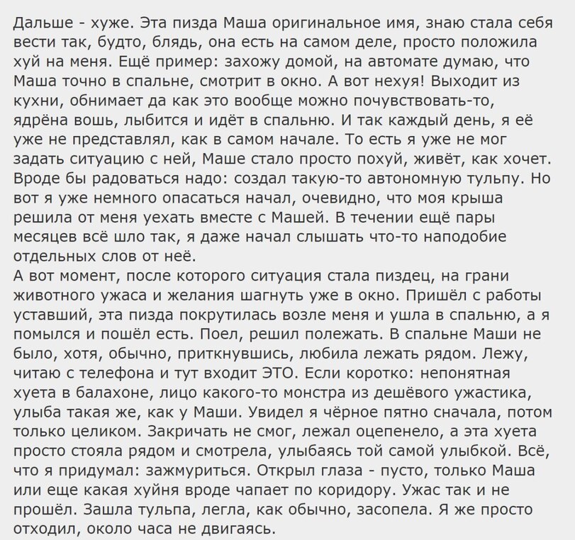 >>109135 >меньше криппи-паст читай Только это реальность, а не пасты. Один тульповодов из-за тульпы своих родителей убил, многие люди сходят с ума и т.д.