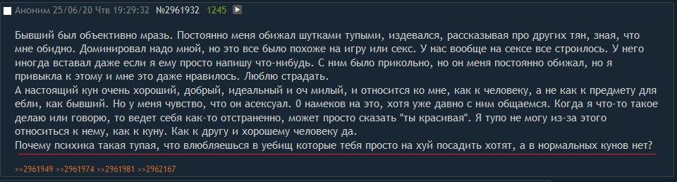 Интересует как и мнение кунов, так и мнение мимопроходящих сисочек. Тян, 25 лет. Не могу развивать нормальные отношения, т.к. в какой-то момент всё упирается в одну проблему: я стойко ассоциирую проникновение мужчины в меня с чем-то унизительным. Это вшито в подкорку по ряду причин: 1) Слова и фразы типа "выебу", "дал в рот" и подобное в речи всегда связаны с доминированием и лидирующей позицией, позицией победителя, а вторая сторона - проигравшая; 2) Проникновение = овладение чужим телом; 3) В мужском социуме быть выебанным считается самой унизительной хуйней, принимающий хуй - буквально низшая ветвь эволюции. Доходит до того, что даже в гомосятских коммьюнити пассивов за людей не считают.