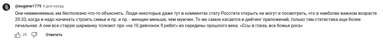 > А то время как в России женщины в избытке Это женский феминистический миф, который причём они даже специально не выдумывали, а просто однажды не разобрались в цифрах, с тех пор и повелось. Как здесь уже выше было показано, в России ощутимая нехватка женщин и сильный перекос из-за этого на рынке знакомств. Плюс импорт мужчин и экспорт женщин только усугубляет ситуацию.