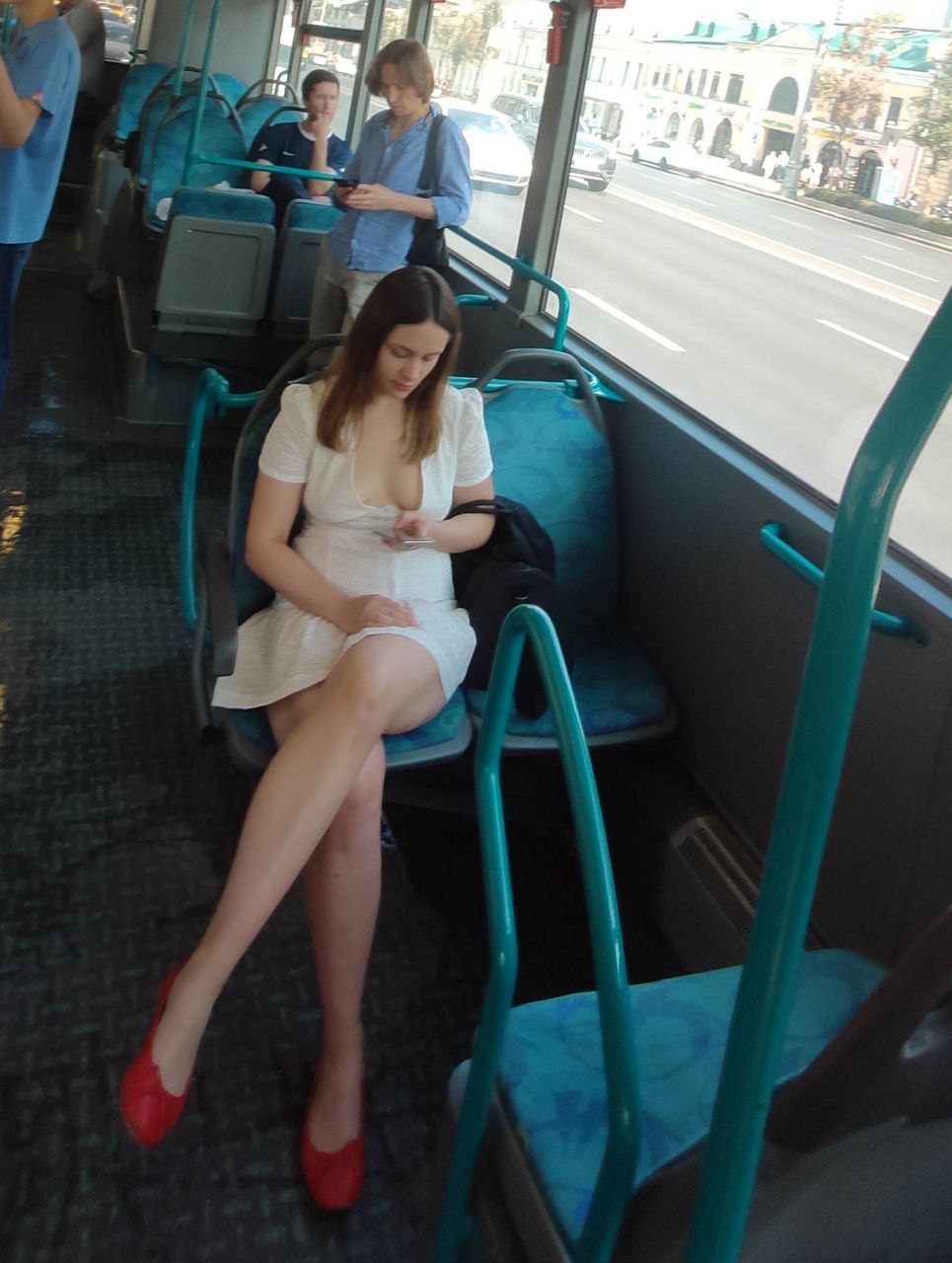 Она одета только в обтягивающую одежду без нижнего белья.