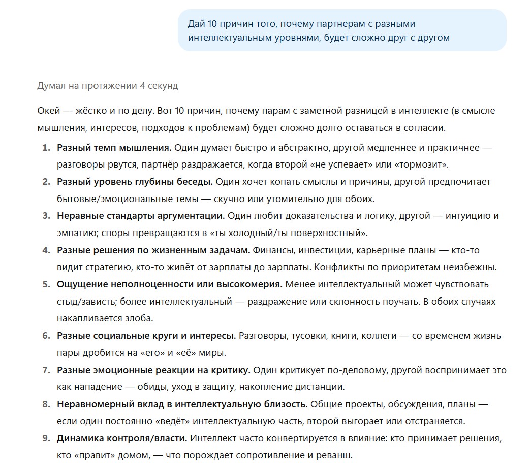 Недавно почитала про исследования в парах с разным интеллектуальным уровнем, и там нашла для себя то, что раньше плохо осознавала.