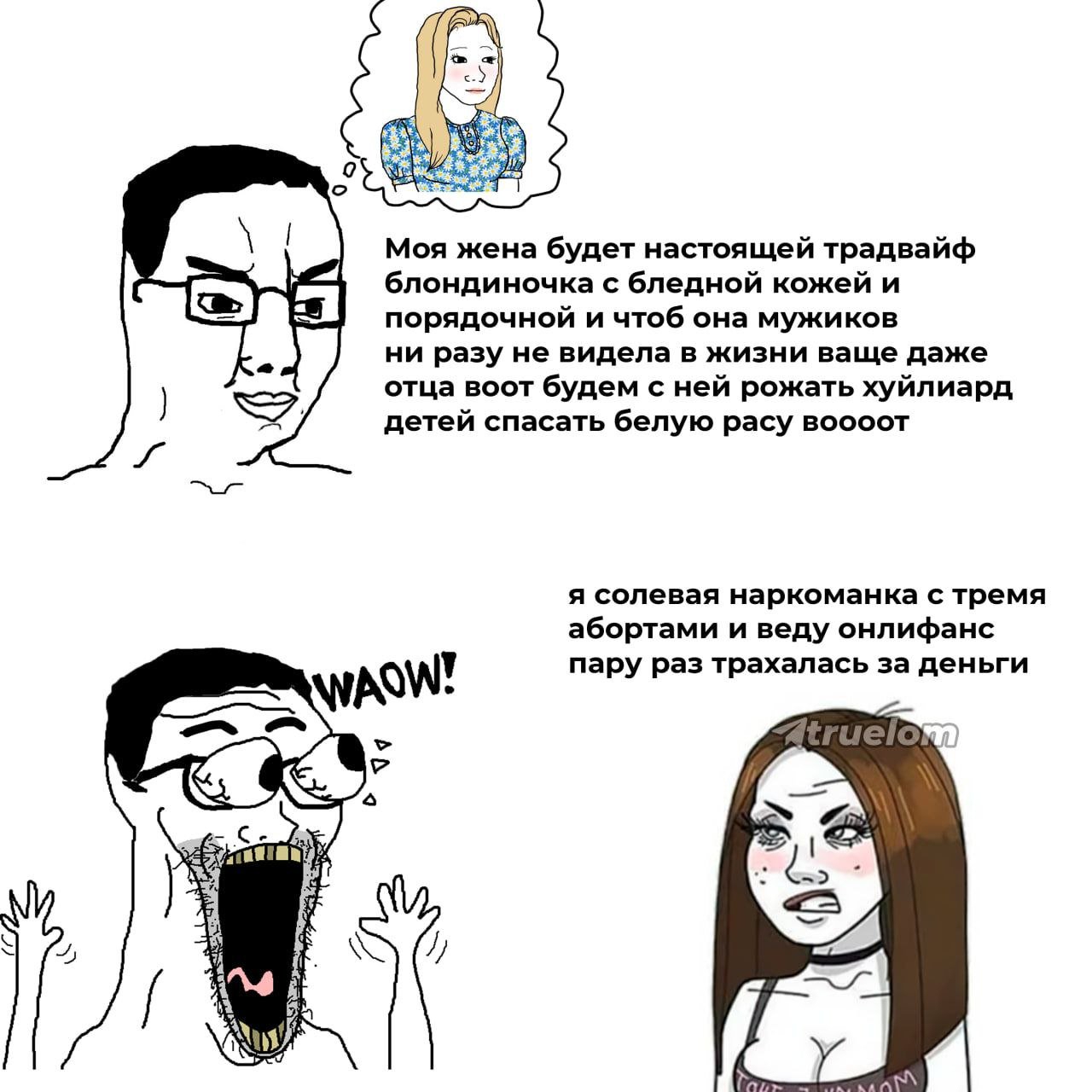 >>10341291 >Не могу представить, как можно аргументировать выбор партнера с определенными личностными качествами. Да тут анон выше писал, в отношениях не может быть критериев интеллектуальности впринципе, как и её линейки. Она сама же критериев никаких не даёт и дико злится когда их просишь. Вот она сказала мужик тупой - значит тупой. Весь критерий. >Ребенок прогрызет тебе дыру в бюджете, и делить эту финансовую нагрузку тебе будет не с кем. Оплачиваемый декрет, мат. капитал, алименты, помощь малоимущим - это достаточный уровень безопасности, которого не было например лет 500 назад ни в каком виде. >большинство обычных (не моделей из инсты) женщин в последний раз розочку получало в 1997 году на выпускной И смысл после этого вести диалог? На 8 марта все цветочные магазины забиты покупателями, что под вечер пустые полки. Это просто мимолётный пример. >Подозреваю Вместо выдуманных подозрений поинтересуйся статистикой, где женщины чётко указывают причину (в США такая детальная если что) как "пропали чувства", а следующее за ним "мало денег". >Ты в жизни спал только с той самой единственной, которая с тобой до гроба в огонь и в воду? Я бы с удовольствием, только ей ненужен был 18 летний студент-нищеброд, когда есть 30 летние мужики на машинах, желающие (и хотя бы имеющие возможность) создавать семьи. И я баб не виню, я их понимаю. Только не надо байки что женщины с теми с кем ложатся спать хотят до гроба, стата разводов это начистую показывает. Первые серьезные проблемы меняются другим мужчиной у которого на данный момент проблем никаких нет. >Ну вот запузырился бы случайно от какой-то своей бывшей, как итог - либо аборт, либо ребенок. Удобно так жить? Мне очевидно нет, а тянам - очевидно да. У них море выбора и максимальное сглаживание своих последствий. Куны же лишены права на выбор как таковой. >Причины я тебе обозначила. Я с ними особо и не спорил. Но ты упорно игнорируешь факт, что в современной реальности женщина вместе с детьми выходит из брака по личной инициативе, а не мужчина уходит от детей/разводится. Но все равно предпочитаешь говорить только о своей безопасности, которая итак обусловлена государством. >Однозначно, лучше, чем рожать, потому что надо, и терпеть мужа, потому что надо. Вот и вскрылась твоя же "любовь" и "желание" иметь детей. К теме про бывших - ниразу не слышал, чтоб кто-то из них сказал "я хочу детей, люблю детей, хочу воспитывать и тд", в этом вся проблема. Женщины не хотят жить ради кого-то другого, будь-то муж или дети, живут только ради себя. И муж терпит жену точно также, как и она его, просто вас это не волнует. >по которой одинокие женщины живут дольше и счастливее, чем замужние. Я с удовольствием на неё взгляну. Принесёшь? (я думаю именно тогда ты на неё впервый раз и взглянешь)