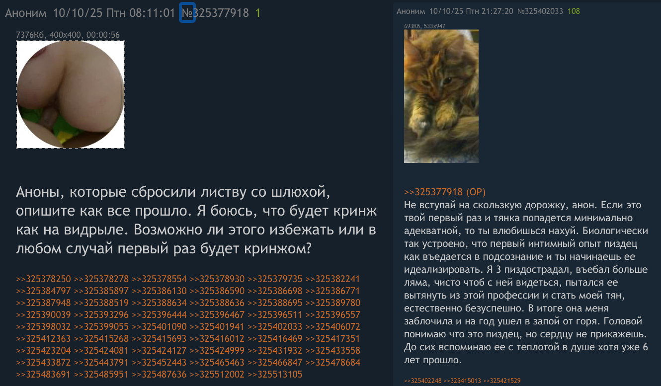 >>10368610 >>10368857 >>10369038 Так-то, анончики частично правы, сейчас что-то идёт как-то всё с чуть большим скрежетом. А может быть это я, жопа ленивая, ленюсь ехать в центр ДС, ибо не дотерплю, обдрочусь. Если уж реально думпостинг про ещё больший пиздец станет правдой и древнейшая профа станет просто недоступной обычным очереднярам, то попробую найти обычнобабу. А какая, хуй, разница, раз и те, и другие мозг ебать будут одинаково? Получается, я в январе 23 года поцеловался и поебался с проституткой впервые, а потом весь год всирал деньги и переебал 30+ стен шлюх, большую часть в ДС. И ещё штук 7 в 2024. И в этом штук 5(с двумя хуёвыми походами). Поэтому, если так, один крайний поход, но нормальный Ну вот прям охуеть какой, чтобы на все деньги и с охуенным впечатлением - и пойду во второй раз пытаться заводить кампанию по нормисному нахождению тни. Что бы ни говорили тут местные, пытающиеся в истерике вывести тебя на тряску, а всё, что для этого надо, у меня есть. Хуй, внешка, общение. Бибобакс будет очень ограниченный. Я не пополамщик, мне так-то похуй, но мне достаточно опыта, чтобы понять, кто ещё хоть какие-то надекжды подает, а кто только на пожрать и попиздеть. >да ты да как да иди вскройся чмохен говно ебло Отъебись.