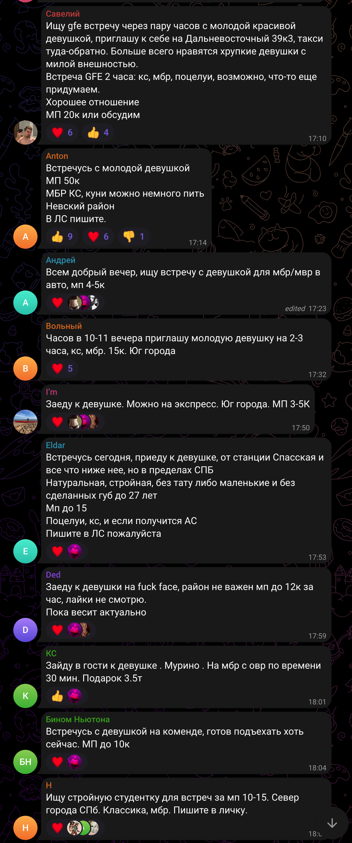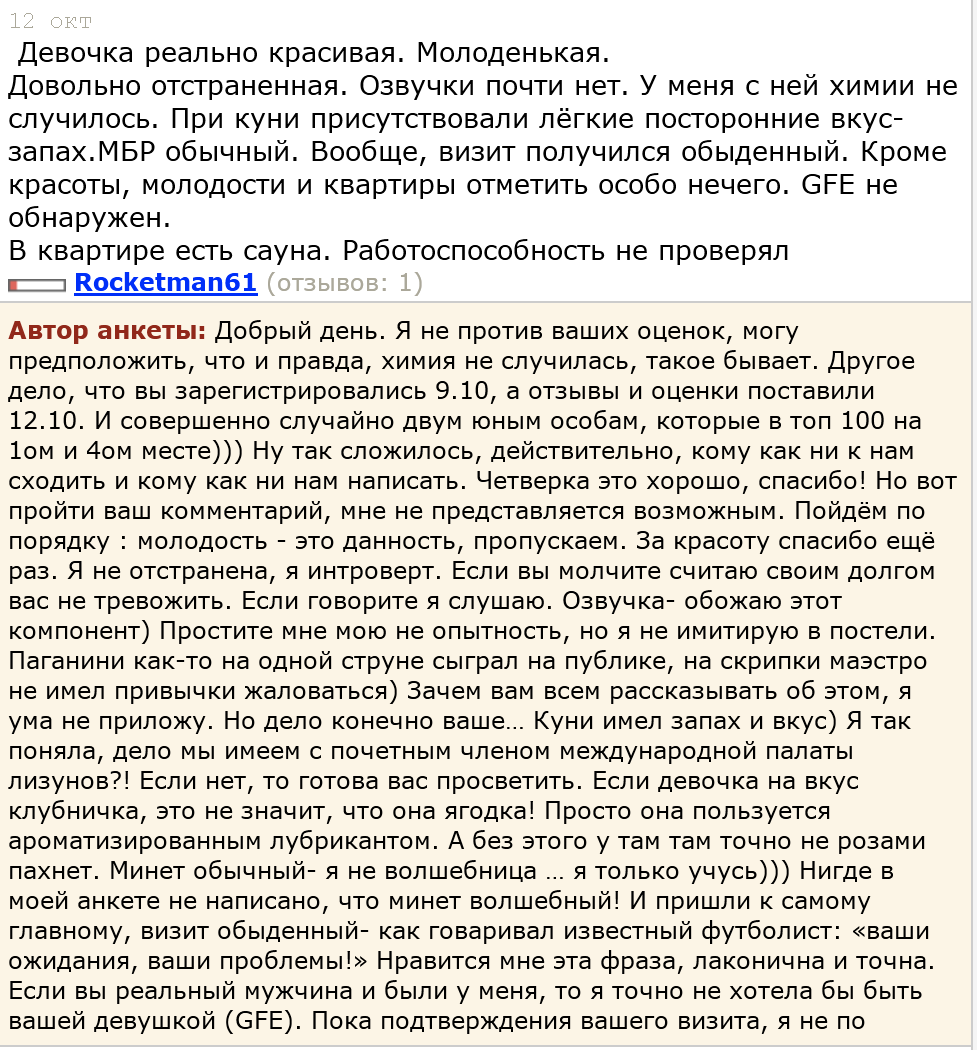 Тут недавно были любители посчитать среднюю занятость дев и их доход. Цифры по 500к и 6 клиентов в день рисовали. Так вот вам реальность из питерского чятика индюшек, где на одного ходока в субботний вечер пачками набрасываются.