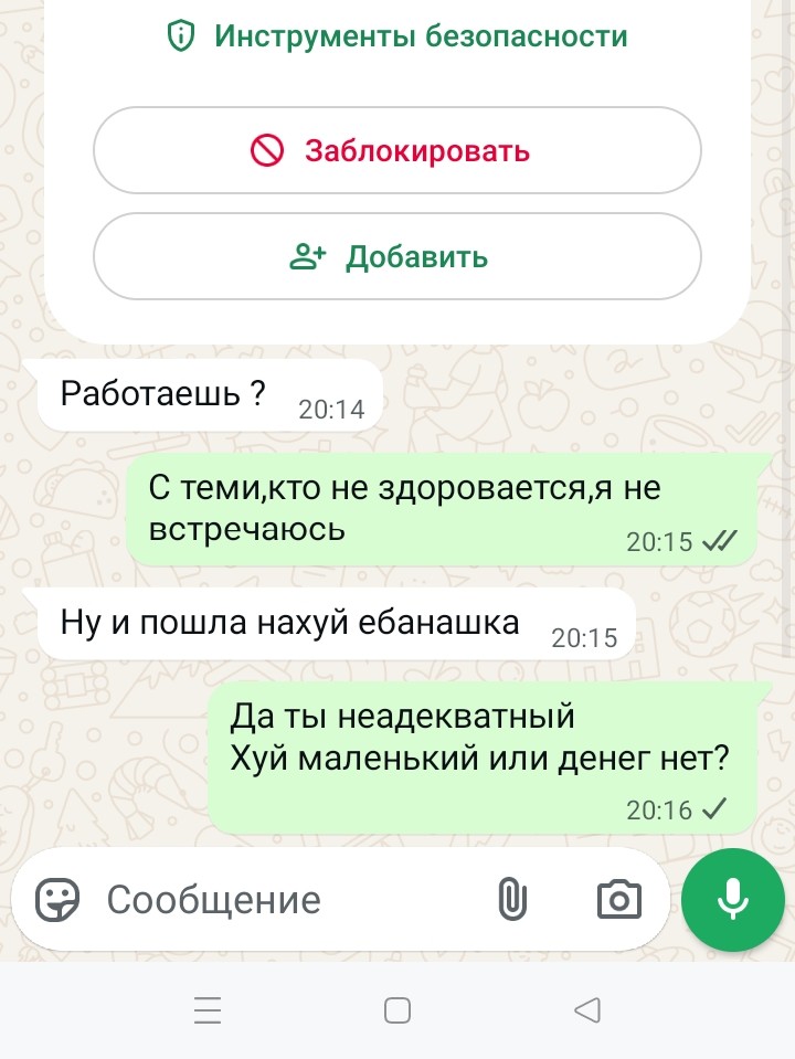 >>10389150 >>10389152 Обменивались, она мне первый раз в переписке отказала. Но что-то стало скучно и я уговорил её за больший ценник. Сначала было 10, потом 15. Но когда уже привёз её в отель, она сказала что всё-таки не хочет. Отвёз её обратно. Моя ошибка конечно, если первый раз отказали не нужно лезть. Но это был единственный случай. Обычно атолиняши либо после фото отказывали, либо всё было ок. Шлюхи ни разу не отказывали, только пару раз корчили ебало.