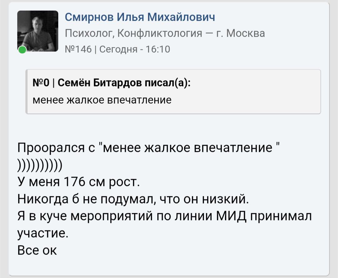 >Ну вот. Может быть всё не так уж и плохо на самом деле у нас? Так ты симпатичный. Меня лишь борода спасает. Просто никому в школе не нужен был повод в виде моего подбородка, чтобы доебаться или поугарать. Стандартная реакция от тян в интернете на моё фото была - постепенное угасание общения. Я нецелованный недержавшийся лист. Женатый теперь. До этого было 10 лет блэкпила с полной изоляцией от женского пола.
