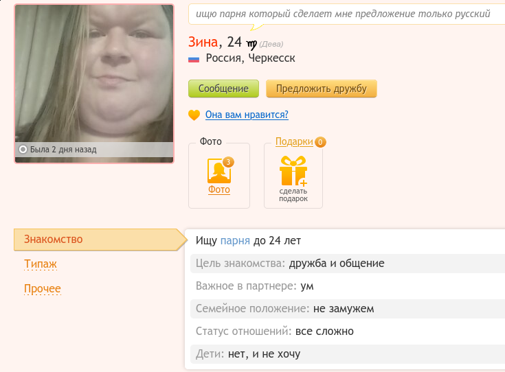 >>10392079 Чушь собачья, я в свое время, наверное, написывал сотням тян из контакте. Там отвечает вообще хоть что-то, в принципе, меньше половины. И большая часть ответов этой издев. Согласилась встретиться только одна, и то не пришла, то есть тоже издевалась.