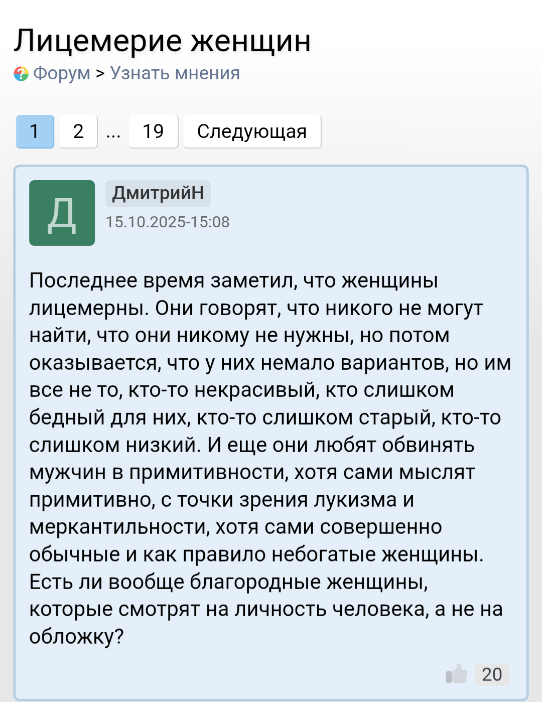 >>10391394 >>10391694 >>10392249 Единственная причина почему сейчас многие нормальные, здоровые мужчины законно не могут удовлетворить свои естественные сексуальные потребности — это свобода женщин. Женщины могут позволить себе выбирать. Всё. Других причин нет. Если бы государство ввело жесткое регулирование по моим предложениям >>10391394 эта проблема исчезла. Где много свободы, мало справедливости. Вот есть такой народ цыгане. Много вы видели цыганок на сайтах знакомств? Я не видел. А все потому что у них родители женят и выдают замуж детей. К сожалению, у малого числа народов остались такие традиции.