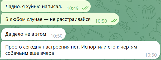 >Я искренне рад, что у тебя она есть. Блять неиронично рад. Спасибо. Остальным анонам я того же желаю. Даже анону, что котов обижал, и анону с тредом про анусы.