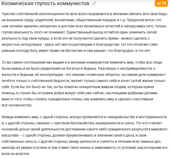 Вспомнил сейчас блогера, который подкатывал к рандомным тянкам и трахался с ними буквально каждый день. Но ближе к 30 годам за ним пришел норвуд рипер. Смешно, он даже не облысел полностью, а уже сразу сошел с ума и начал пить свою сперму и сперму своего друга на камеру. Это так жалко и потешно. Я вот проживу осознанную жизнь, меня уже ничего не сломит, но какой ценой... Ценой унижений, неприязни и ненависти на почве внешки. Лысый, низкий, всратый, без челюсти, косоглазый, с короткими пальцами. Почти фуллхаус, спасибо что не инвал хоть