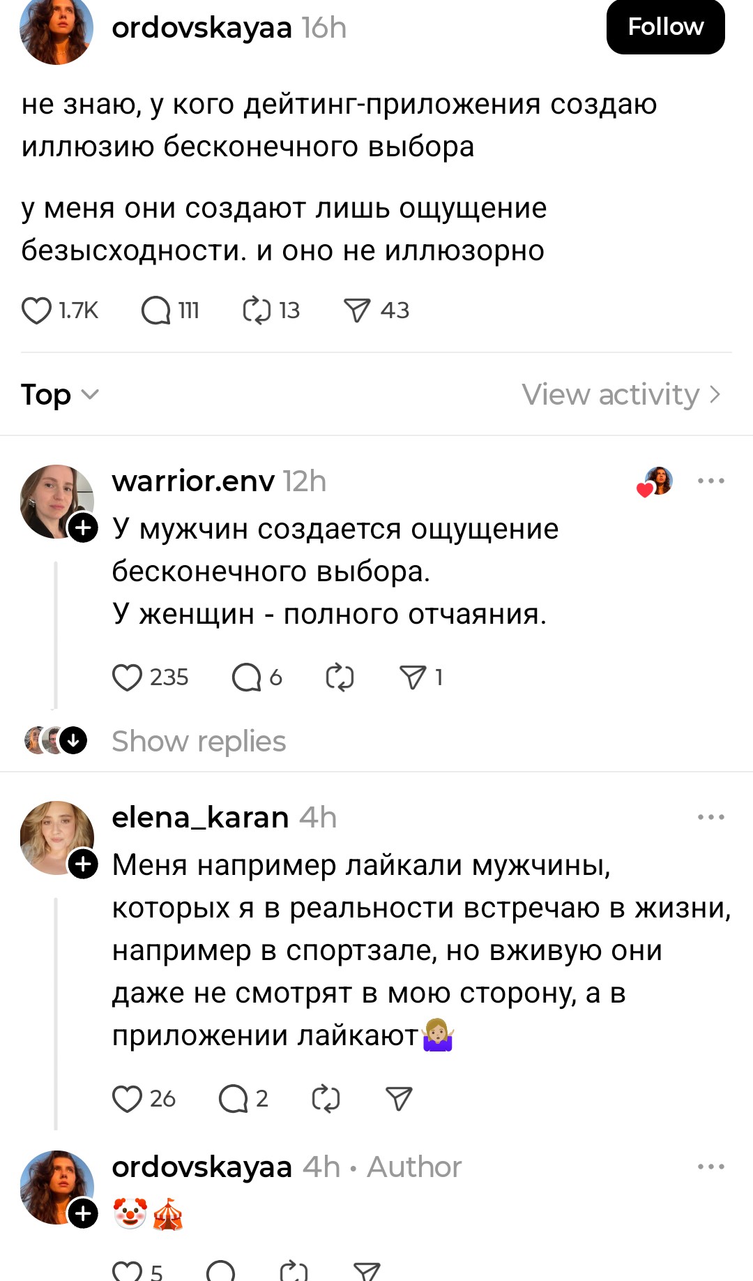 >>10416685 Пробовал в этом году в тиндере общаться с 33-х летней с другого города, даже ему первая написала,но быстро интерес ее угас и она в Одессу поехала, потом ещё где-то путешествовала это было летом. Ему надоело что она пропадает и диалог угас. На этом его любовные приключения закончились(пока что).