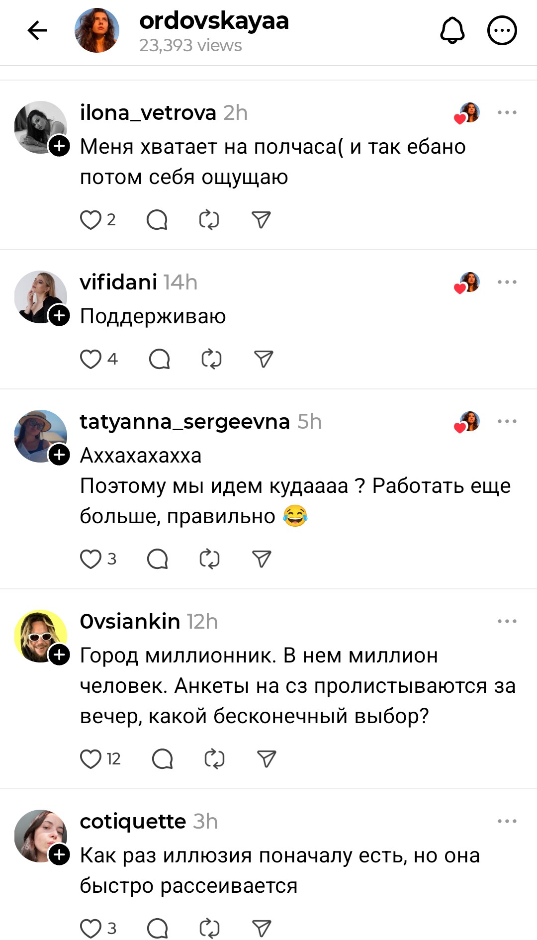 >>10414737 ну мне так тянки говорили знакомые за свою подругу, вот пиши первым тянке(даже не виделись еще) она ждёт что ты будешь писать первым, она любит чтобы парни первые писали и парень если первый не пишет, то он редфлаг! ведь она же спрашивала за тебя, но на встречу общую с компанией не пошла, отмазки появились, вопрос чтобы изменилось если бы написал? вот и спрашиваю тебя, что ты бы делал в такой ситуации, если подобная тян выше тебя по внешке и статусу и со старта где личного контакт не было уже начинать ей что-то писать
