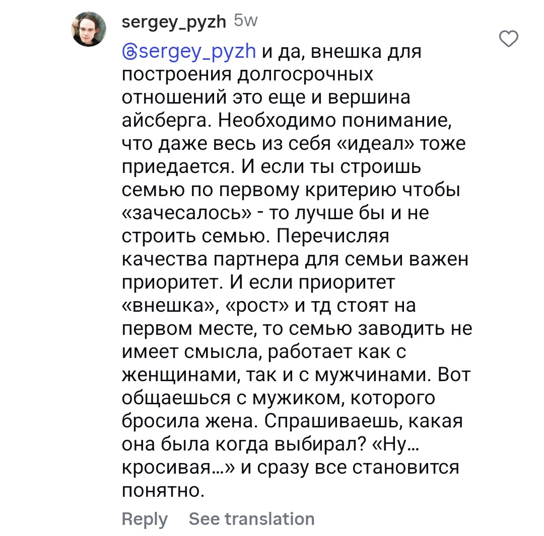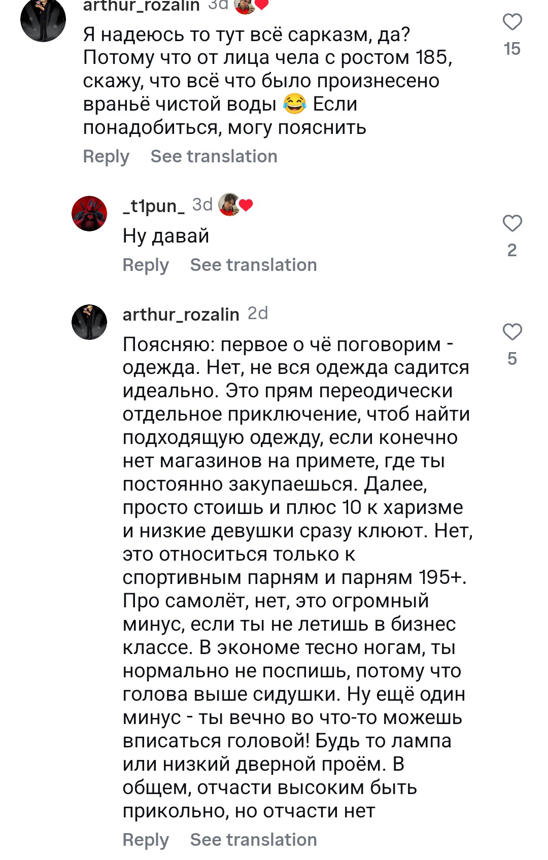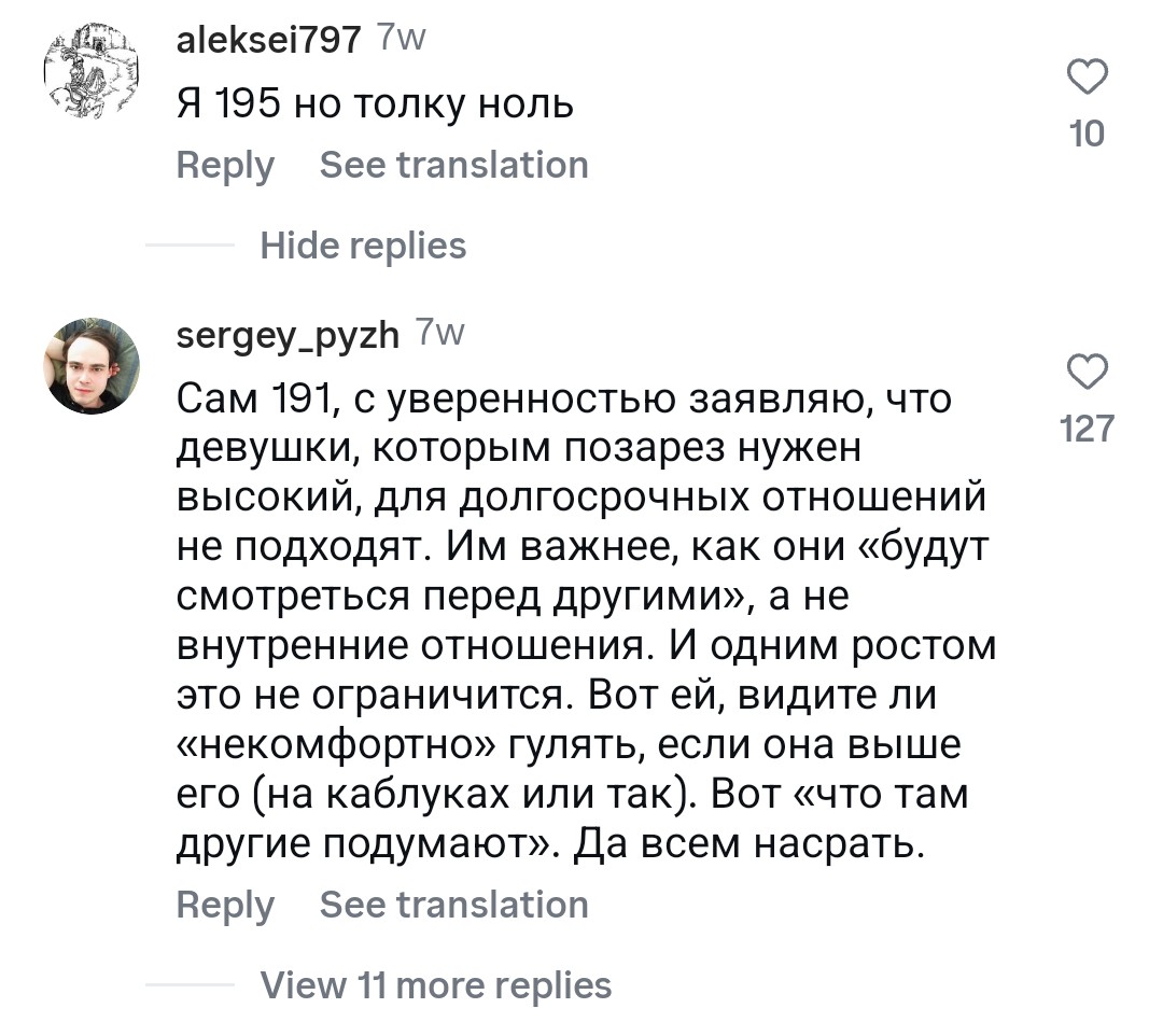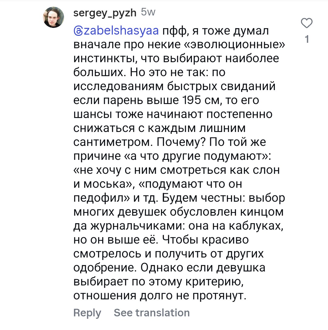 Во-вторых, фраза про «деньги, статус и хуй с ебалом — это дополнения к рослому мужчине» звучит так, будто рост — это база, а всё остальное вторично. Но ты же понимаешь, что если у чела нет характера, мозгов и личности, то рост ему не поможет? Он просто будет высоким статистом, на фоне которого другие пацаны будут выглядеть интереснее.