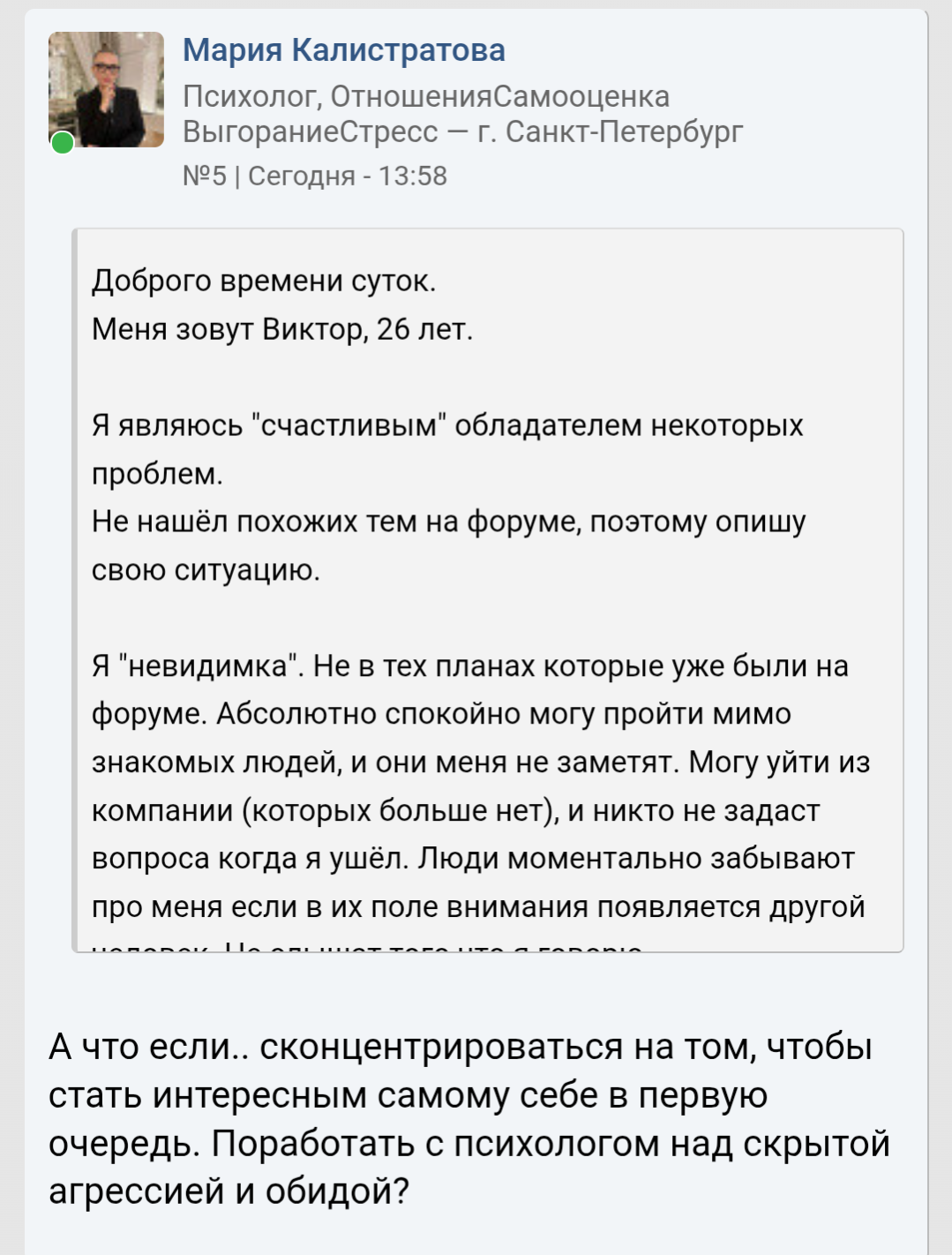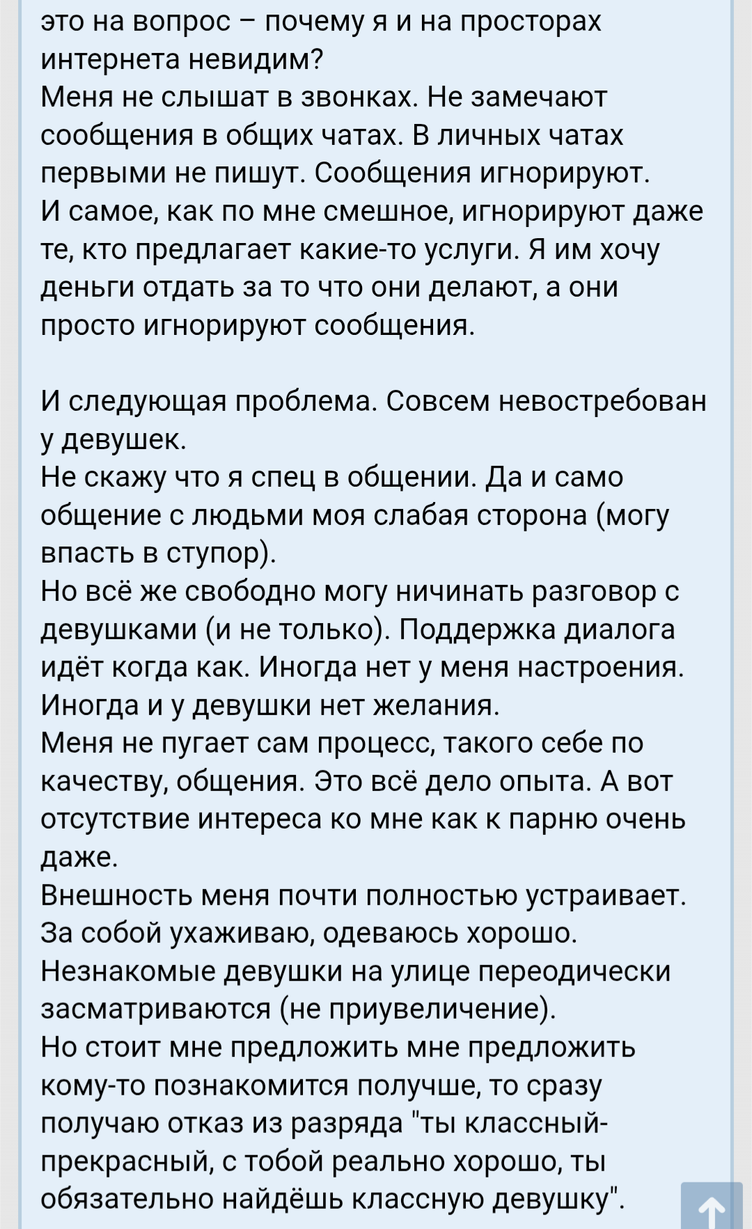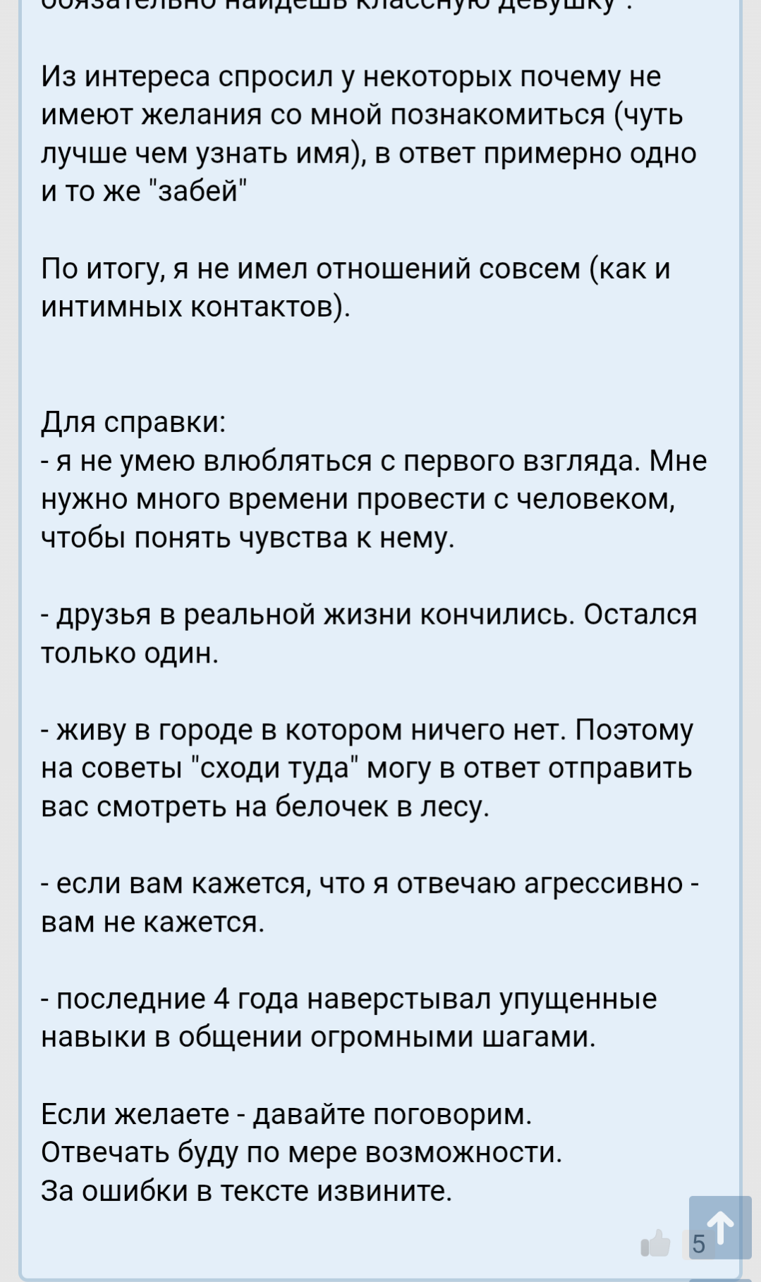>>10425122 Нет не обижаюсь. Потому что на СЗ когда фотографии выставлял - было по нулям. В моём понимании всратый ебальник это не помеха для полноценной жизни. А вот рост, субтильность, здоровье и может быть ещё возраст - ещё как помехи. Вот они реально руинят. К