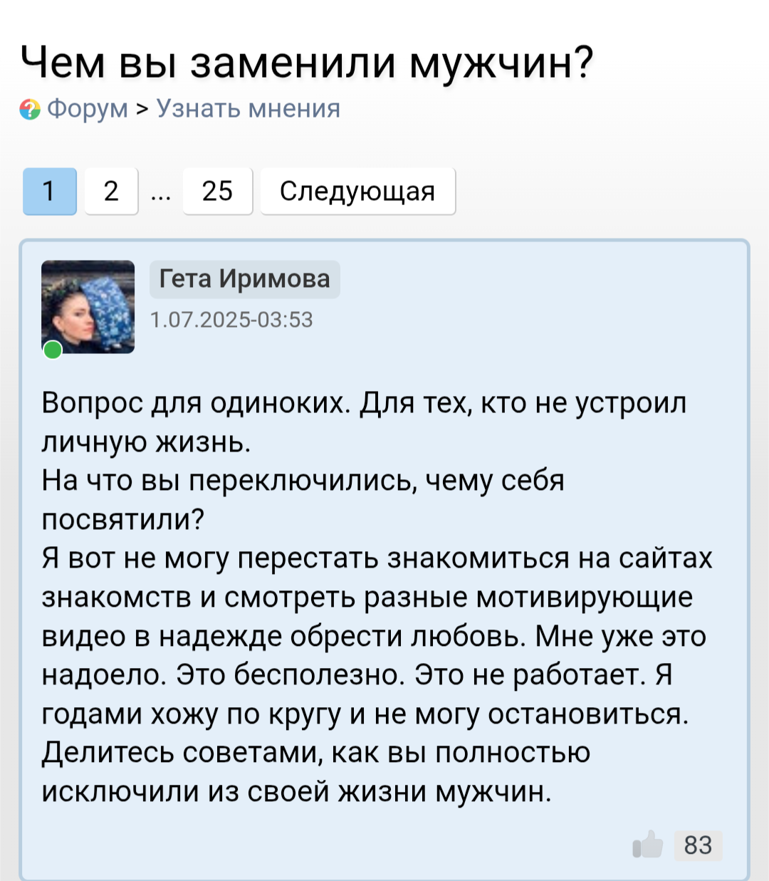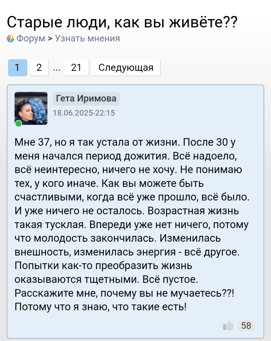 Интересно, сколько таких, как она - никому ненужных женщин немолодого возраста? У нее все темы пропитаны болью и тоской. Как бы вот с такой познакомиться