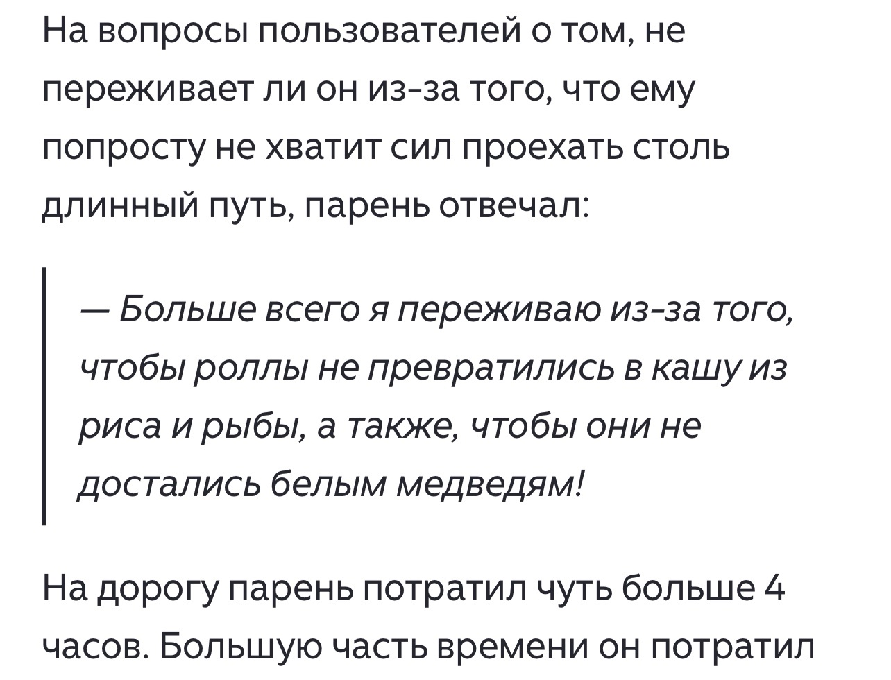 >>10432844 Там была целая экспедиция на снегоходах с сопровождающими, чтобы роллы привезти. В итоге его на порог не пустили, он за 11к отправился в гостиницу ночевать. И дело дело происходило на Шпицбергене, открой карту и охуей.