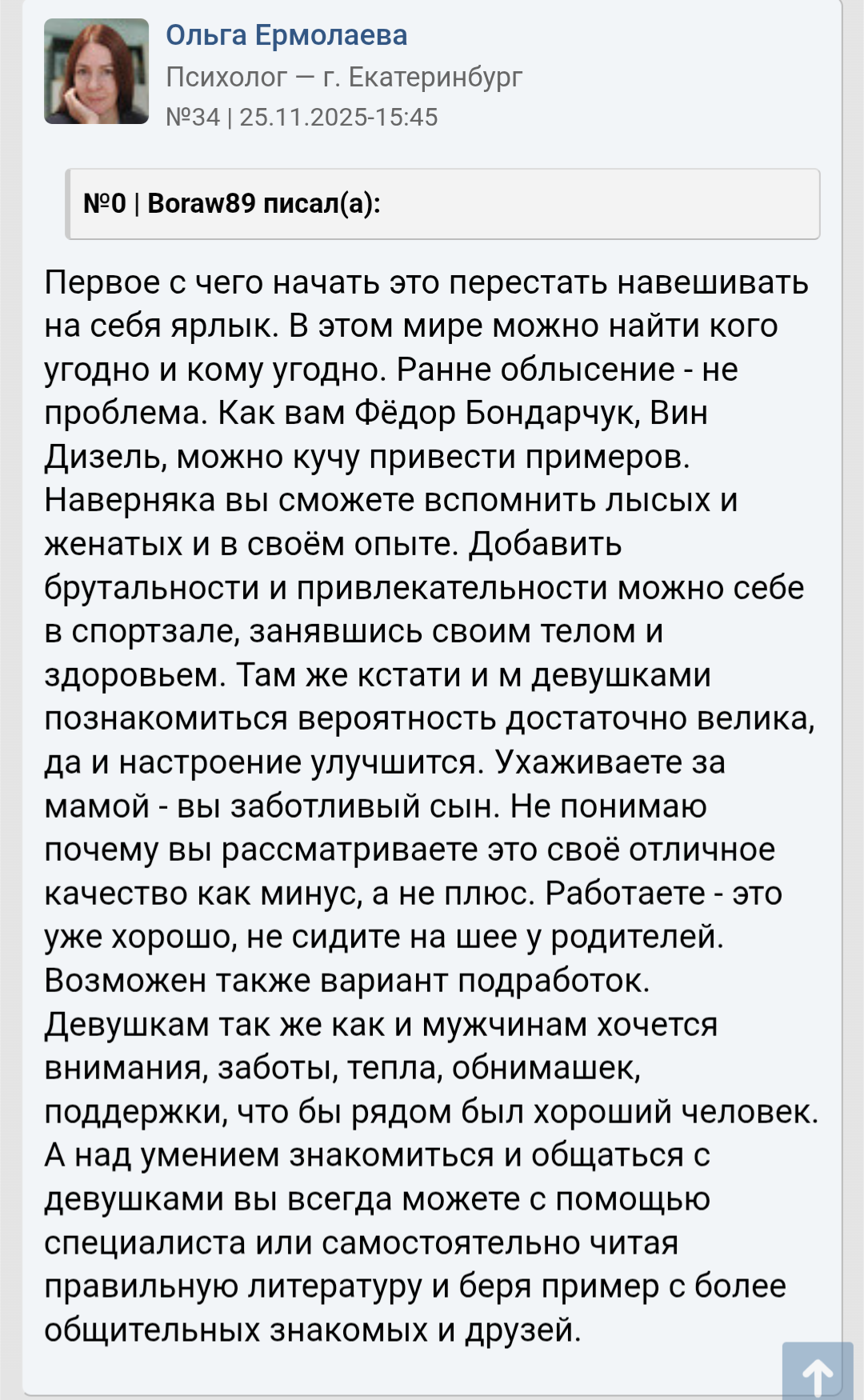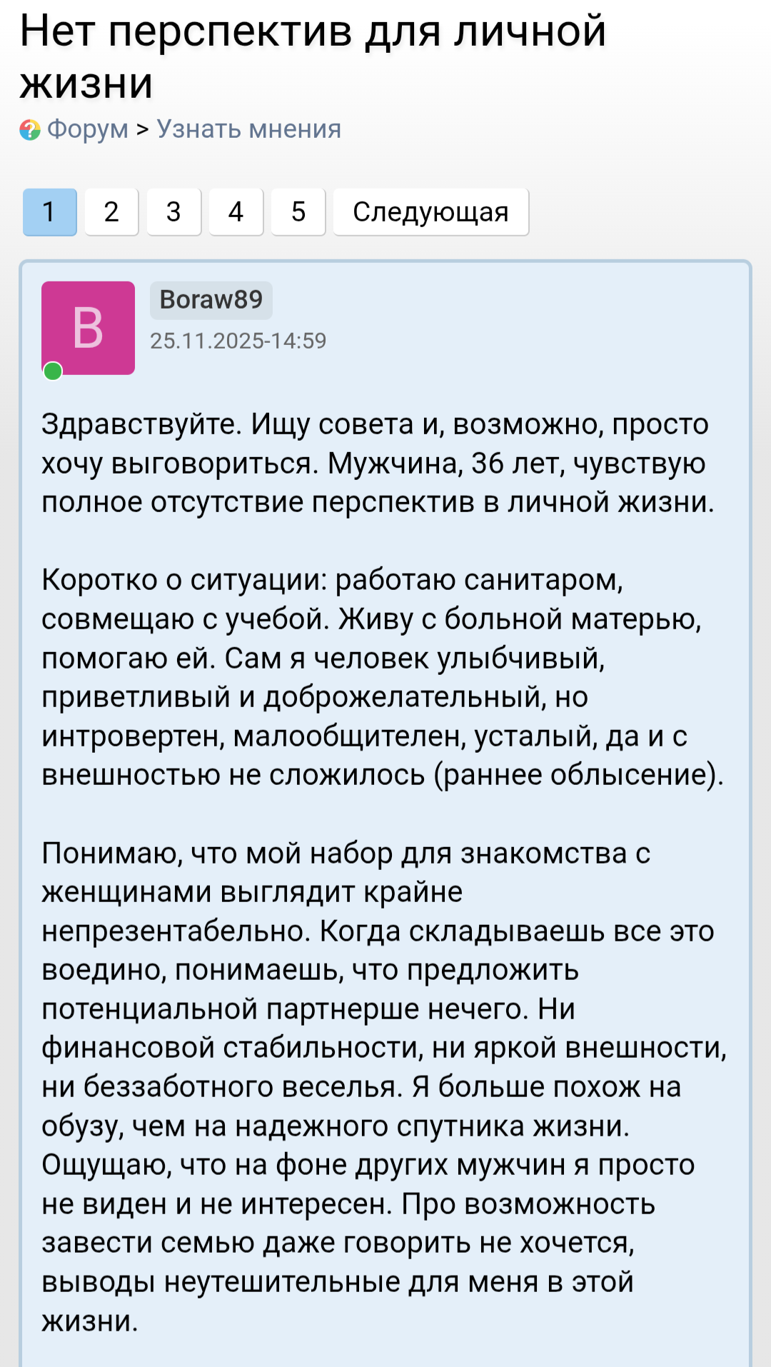 >>10441954 У меня вышка заочная есть по которой не пошел работать. Курсы массажа для себя прошел, поработал в свое время на пару дно работах, на права сдал, но тачкой забыл как водить. Сейчас учу английский, учил язык программирования, но решил выучить тестирование, короче айтишка. Хз уже полгода учу, пробовал в одну компанию, отказали из-за английского, поэтому сейчас учить начал больше. Но я хз, если не получится то хз чё делать, у меня сейчас постоянной работы нет, вообще разочаровался, чисто так на автомате делаю это все. Ну и качаюсь стабильно 2-4 раза в неделю чтобы с ума не сойти. Бросил бухать и курить, чтобы не стать конченным алконавтом, а то уже раз попал в наркологичку после жёсткого бухалова, чуть не отъехал. После этого бросил и начал жимцелить, учиться. Но тянок даже это отталкивает, что не бухаю, пару тянок так отказали из-за того, что просто не пью. Ещё 30 лет не хочу, никогда не представлял себя 30 летним. А тут люди на фотках с отношениями, все отлично, не скитались по жизни, все стабильно и нормально, а я в почти тридцатник начинаю все то что другие в 20 начинают, думать за будущее, за хату, тачку, отношения серьёзные и тд Бля ещё надо научиться плавать, так и до сих пор не умею. А у тебя сейчас работа есть, хоть и дно, но ты можешь свободно куда то идти, рисковать, штормить те самые бары и клубы про которые выше писали другие >>10441967 Мне дать стабильность, достаток и я буду счастлив, а тебе дать рост и ты будешь счастлив. Каждому свое нужно для счастья, но одно знаю точно - мы в этом треде не из-за хорошей жизни. У всех общая проблема - невостребованность среди женщин. Причины и следствия у каждого разные, а в некоторых общие.